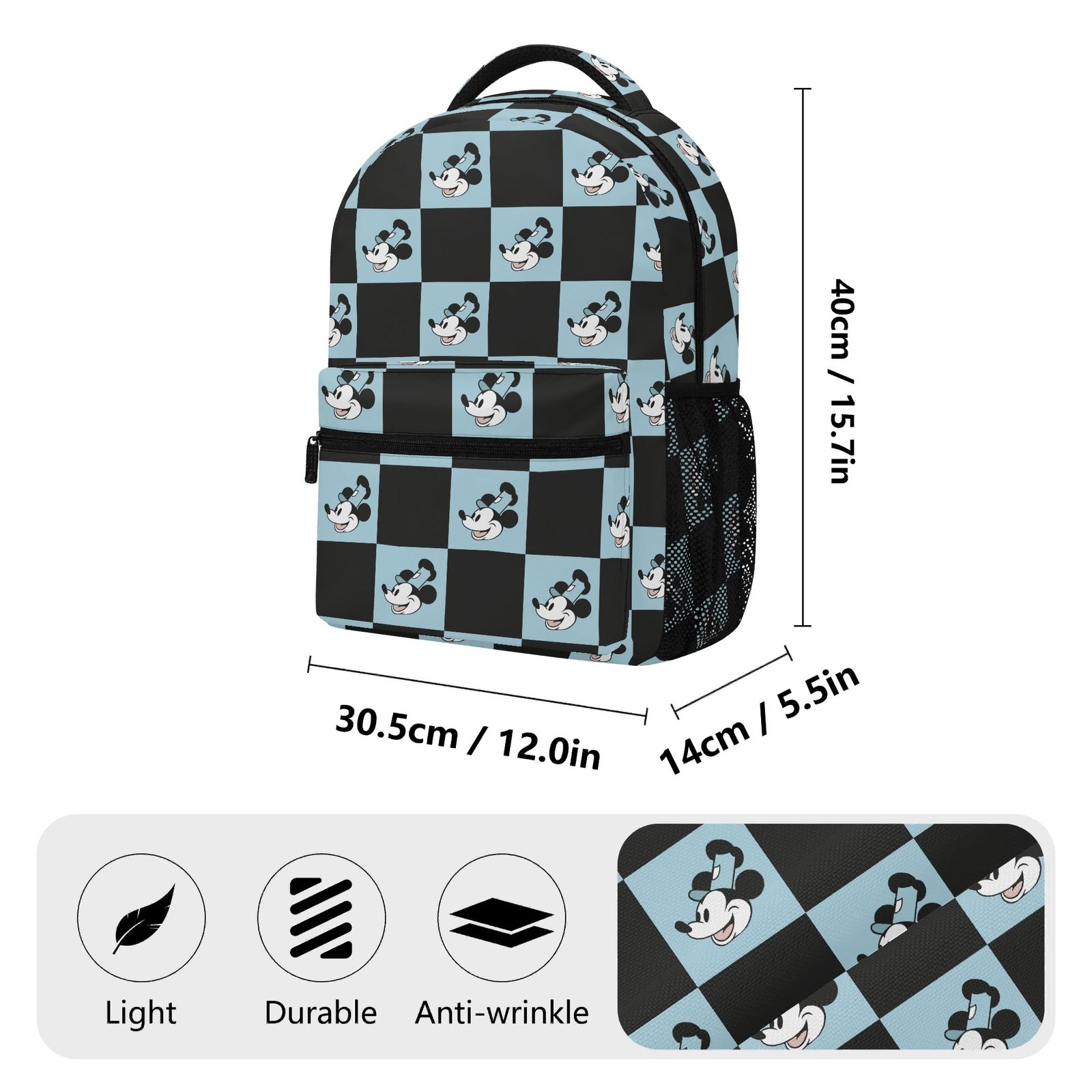 Steamboat Willie backpack crafted from premium twill weave and polyester, it offers lightweight, water-resistant, and durable performance. Featuring multiple compartments and adjustable shoulder straps, it’s ideal for student travel, leisure, vacation, commuting and more. With measurements of 15.7” x 12” x 5.5” this backpack is not too big and not too small. Suitable for children, teens, and adults.
