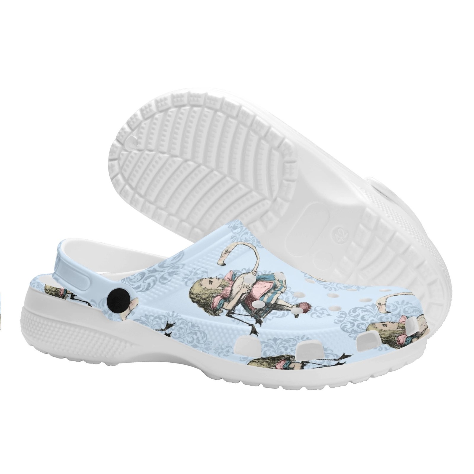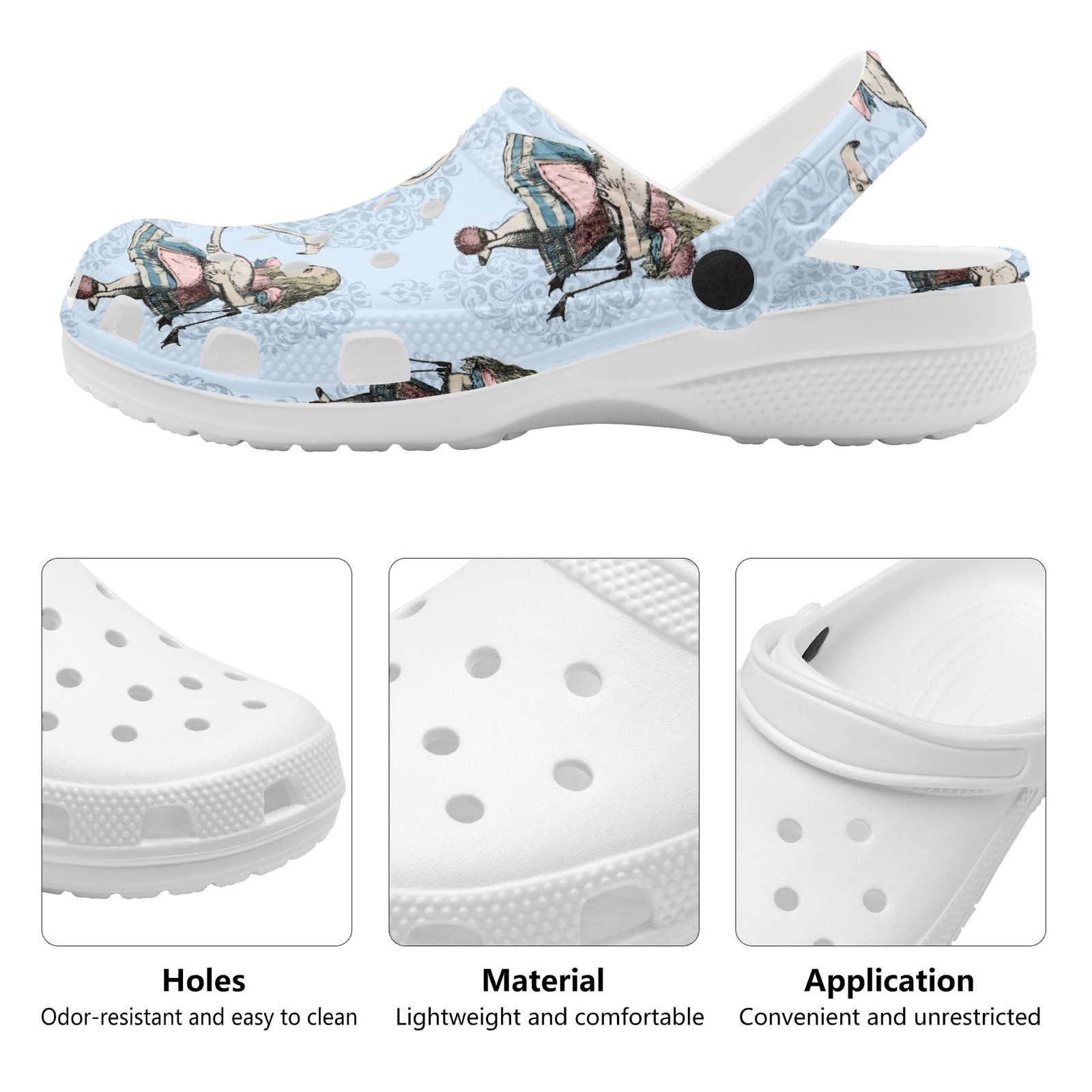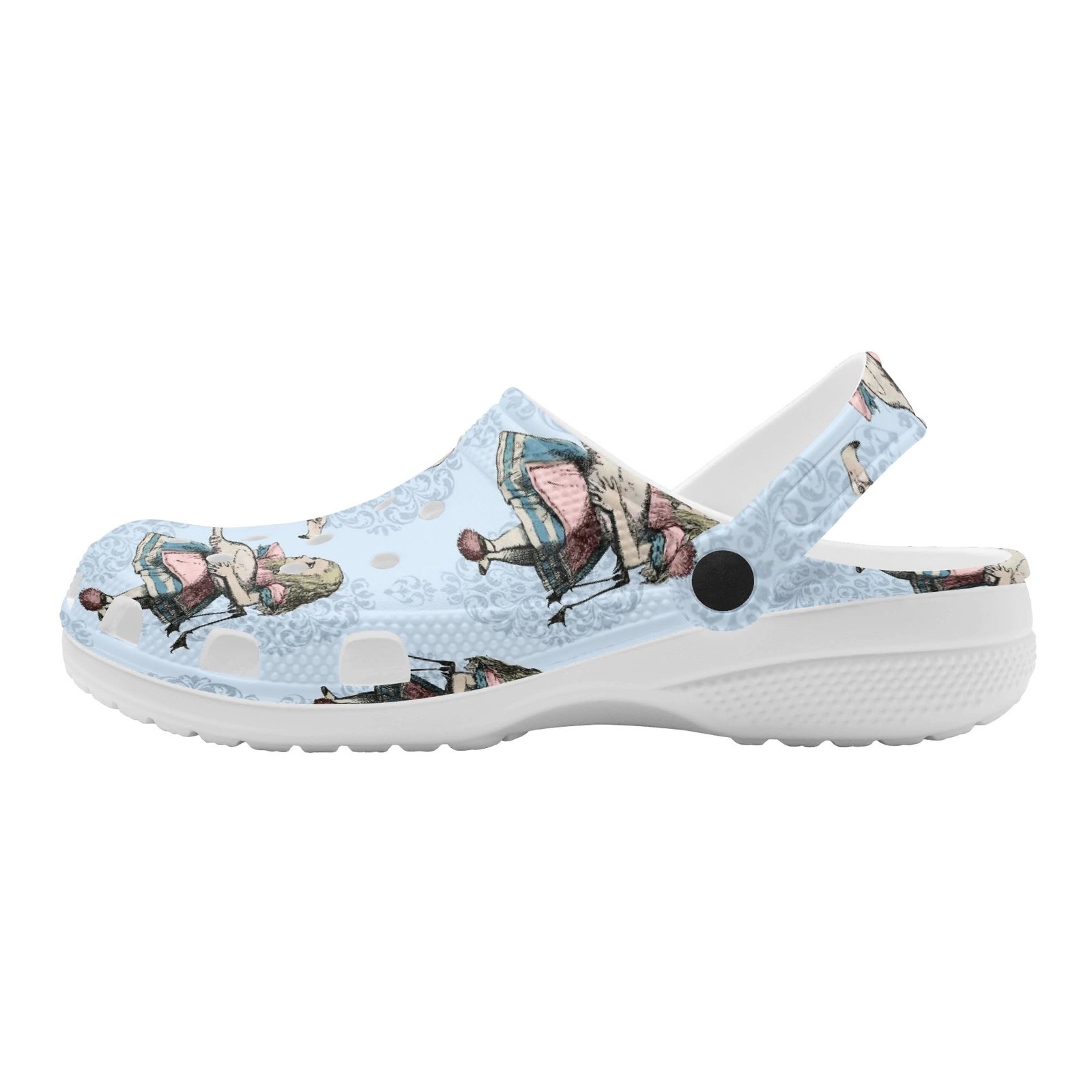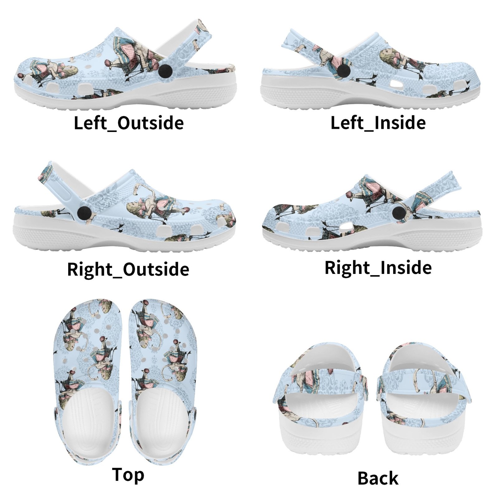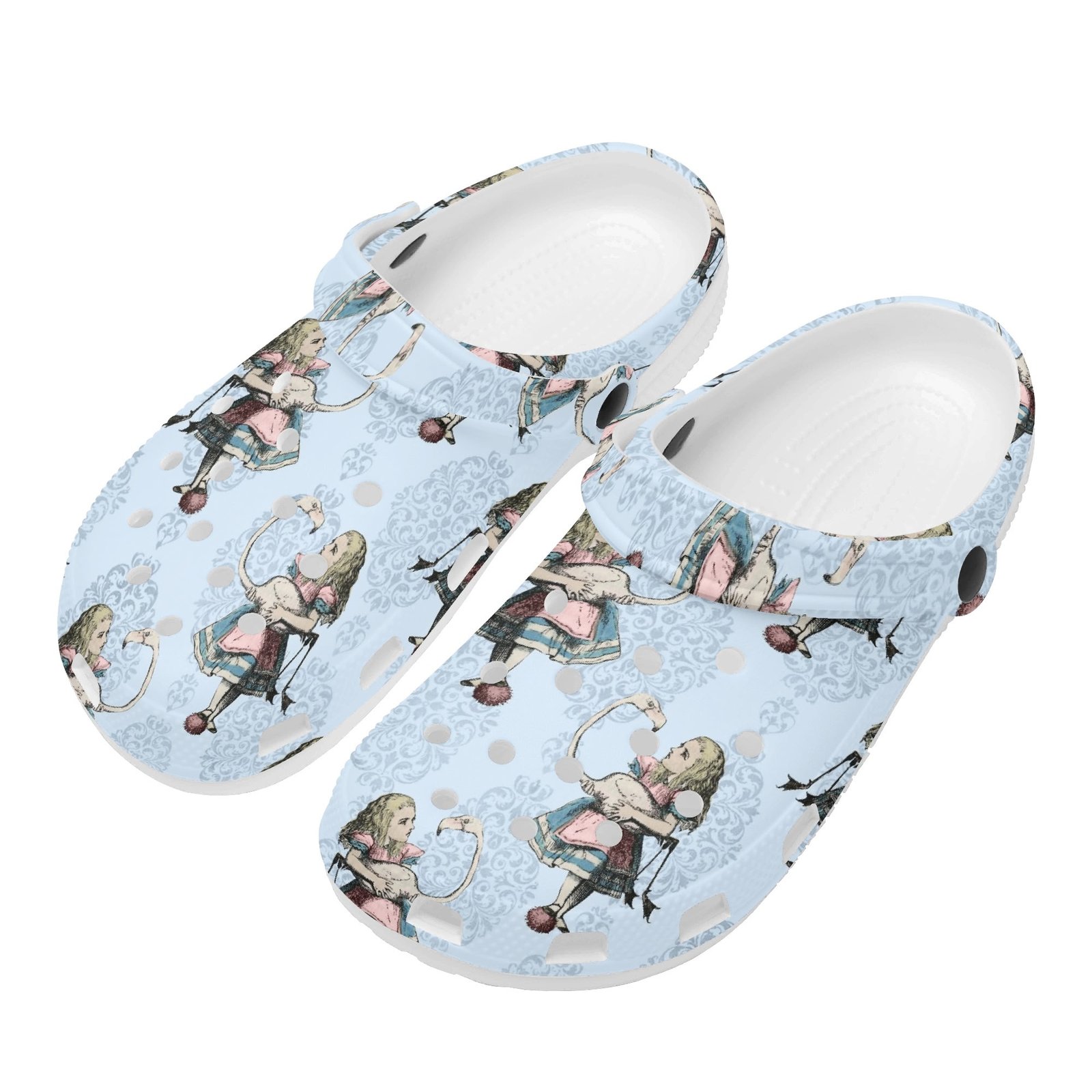 Step into a whimsical world with the Alice in Wonderland Croquet Flamingo Women’s Rubber Clogs in Blue—a playful blend of comfort, color, and classic storybook charm.