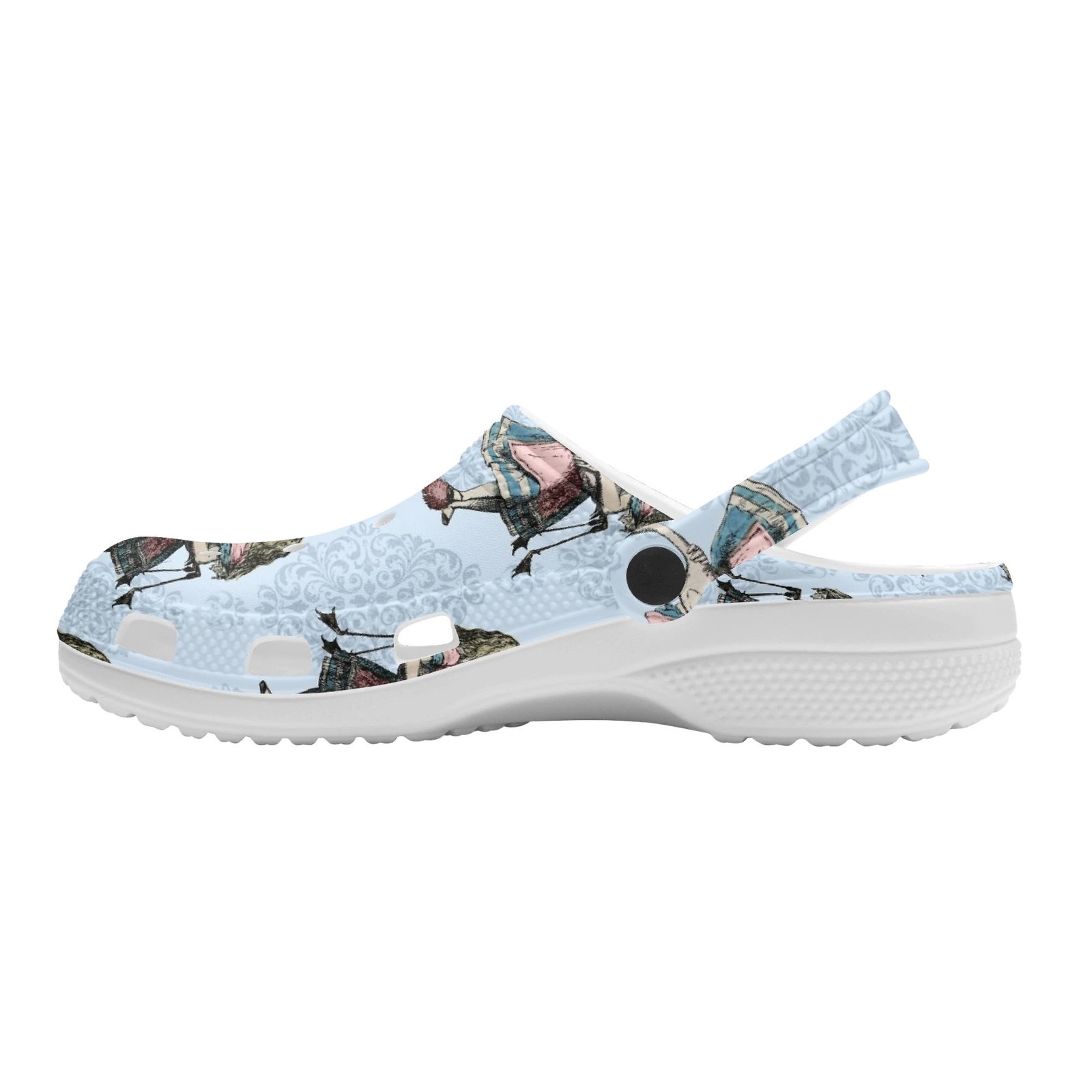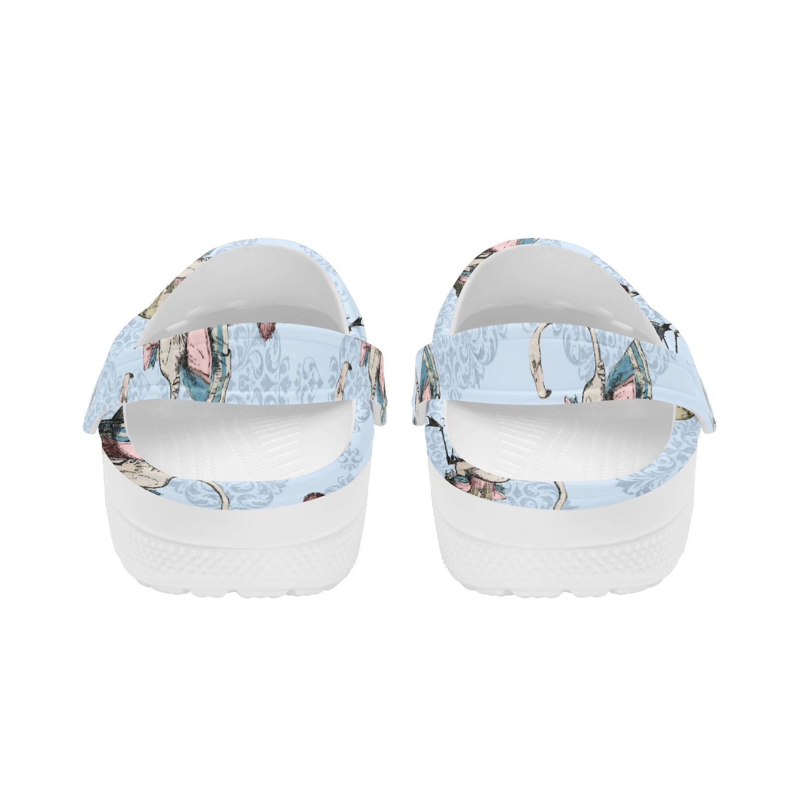 Inspired by the unforgettable croquet scene from Alice in Wonderland, these clogs feature a vibrant blue base accented with charming flamingo details that bring a touch of fantasy to everyday wear. Crafted from lightweight, durable rubber, they’re designed to be water-resistant, easy to clean, and perfect for all-day comfort.