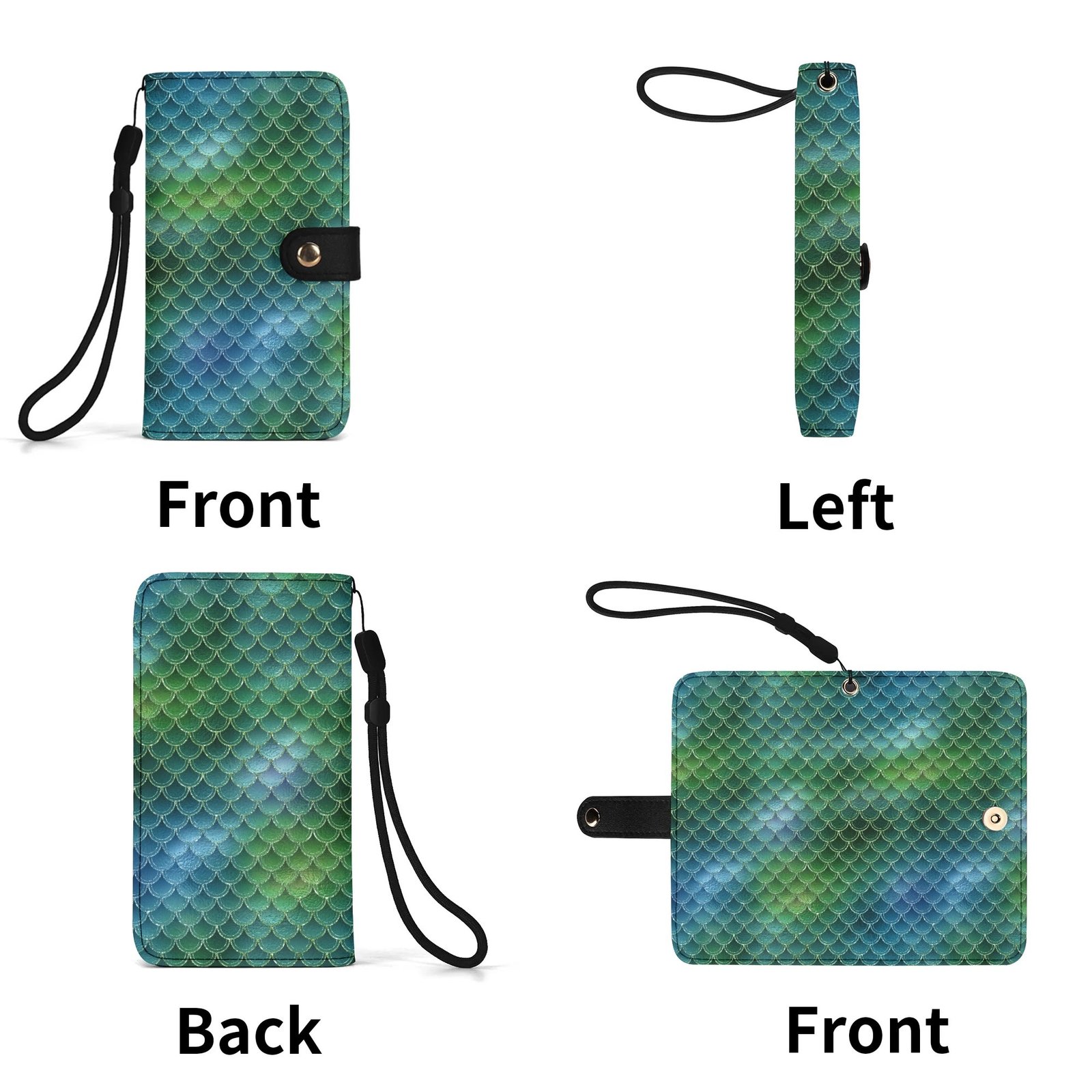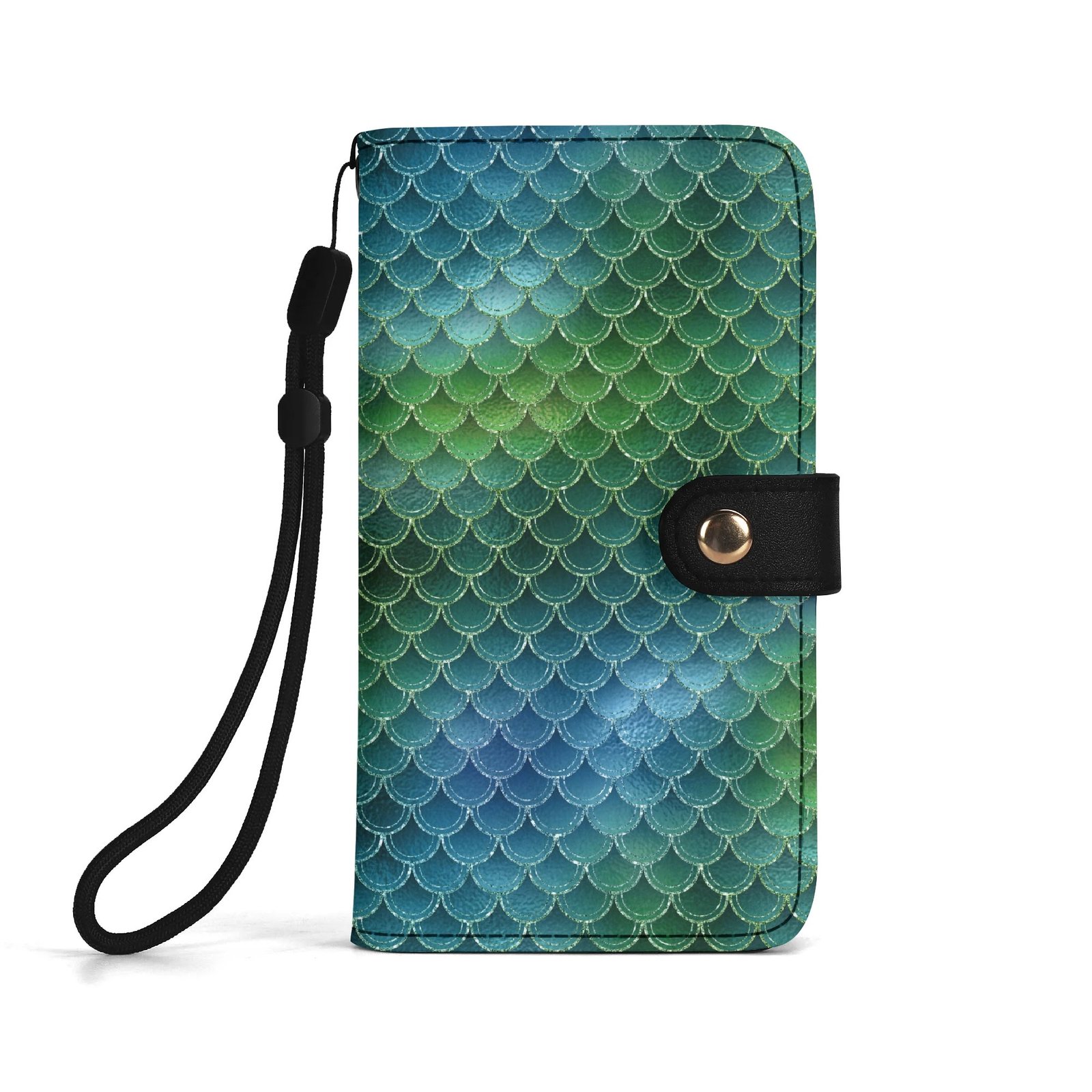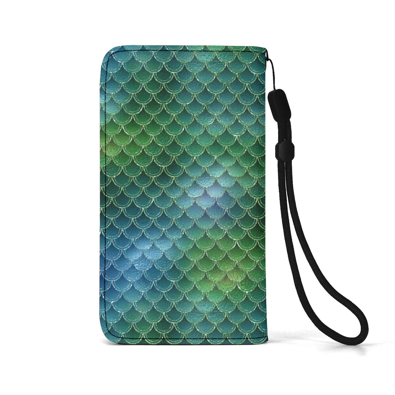 Crafted from high-quality vegan leather this green mermaid phone wallet offers full body phone protection, multiple card slots, a cash compartment, and a flexible phone cradle that fits most smartphone sizes. The detachable wrist strap adds hands-free convenience, making it perfect for days when you want to travel light.