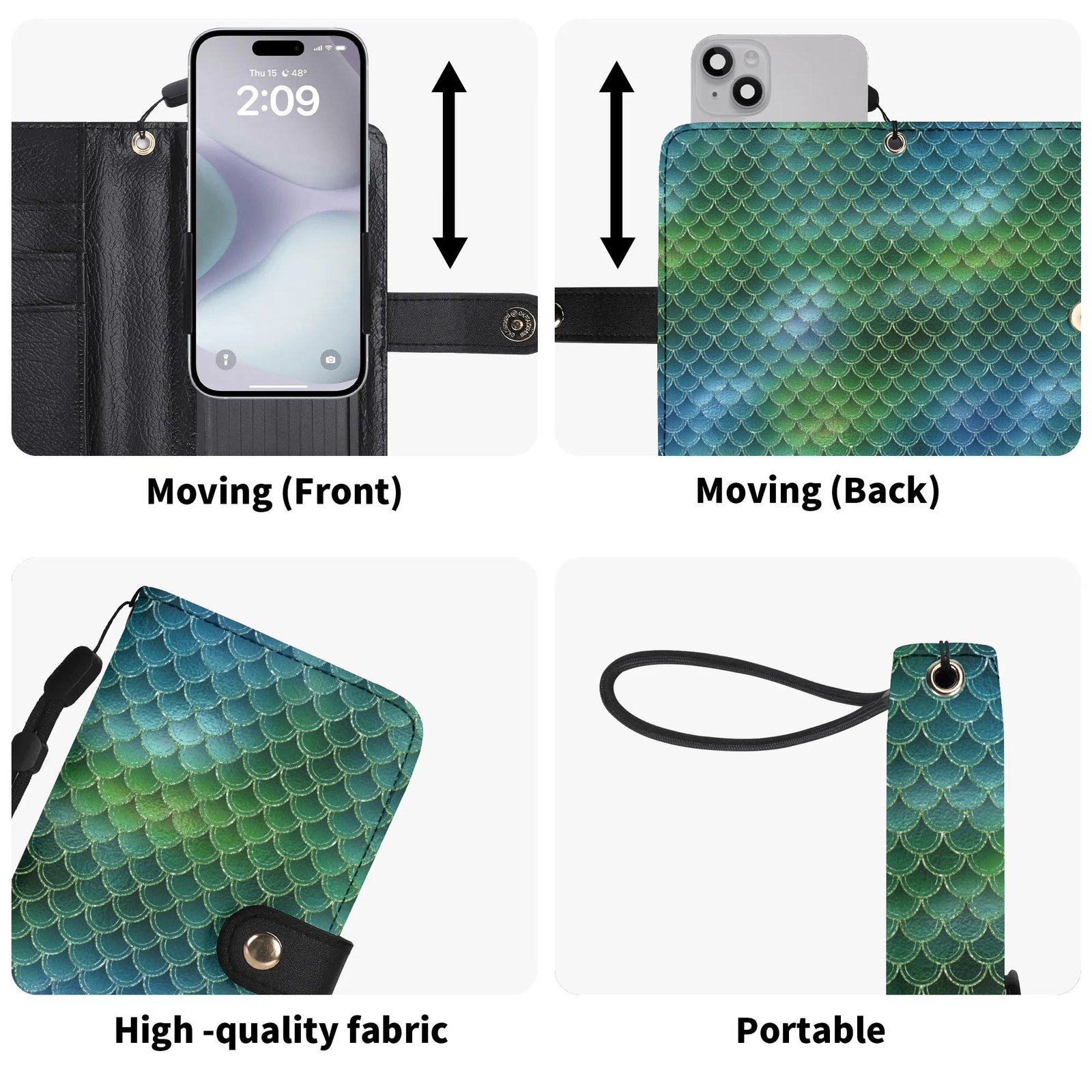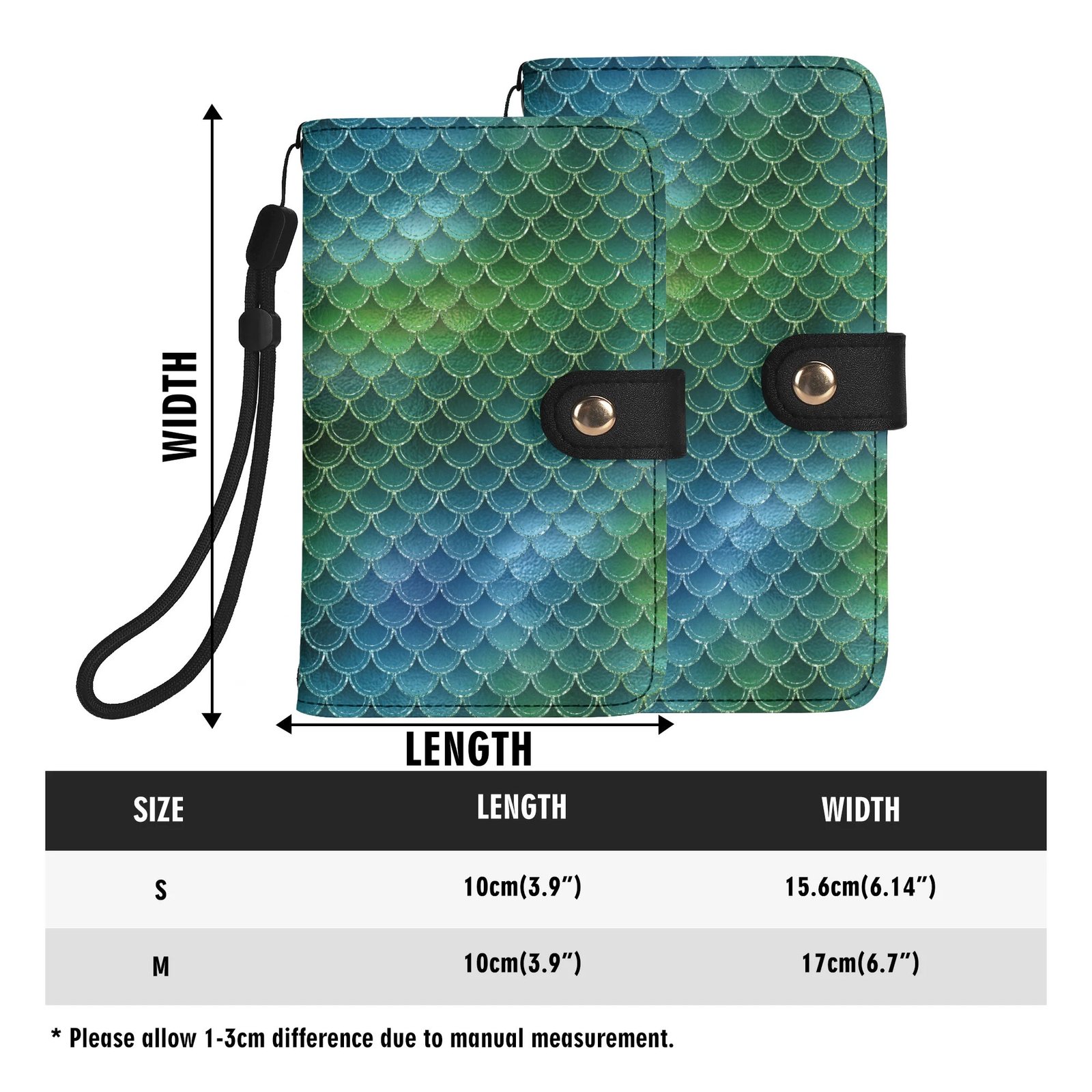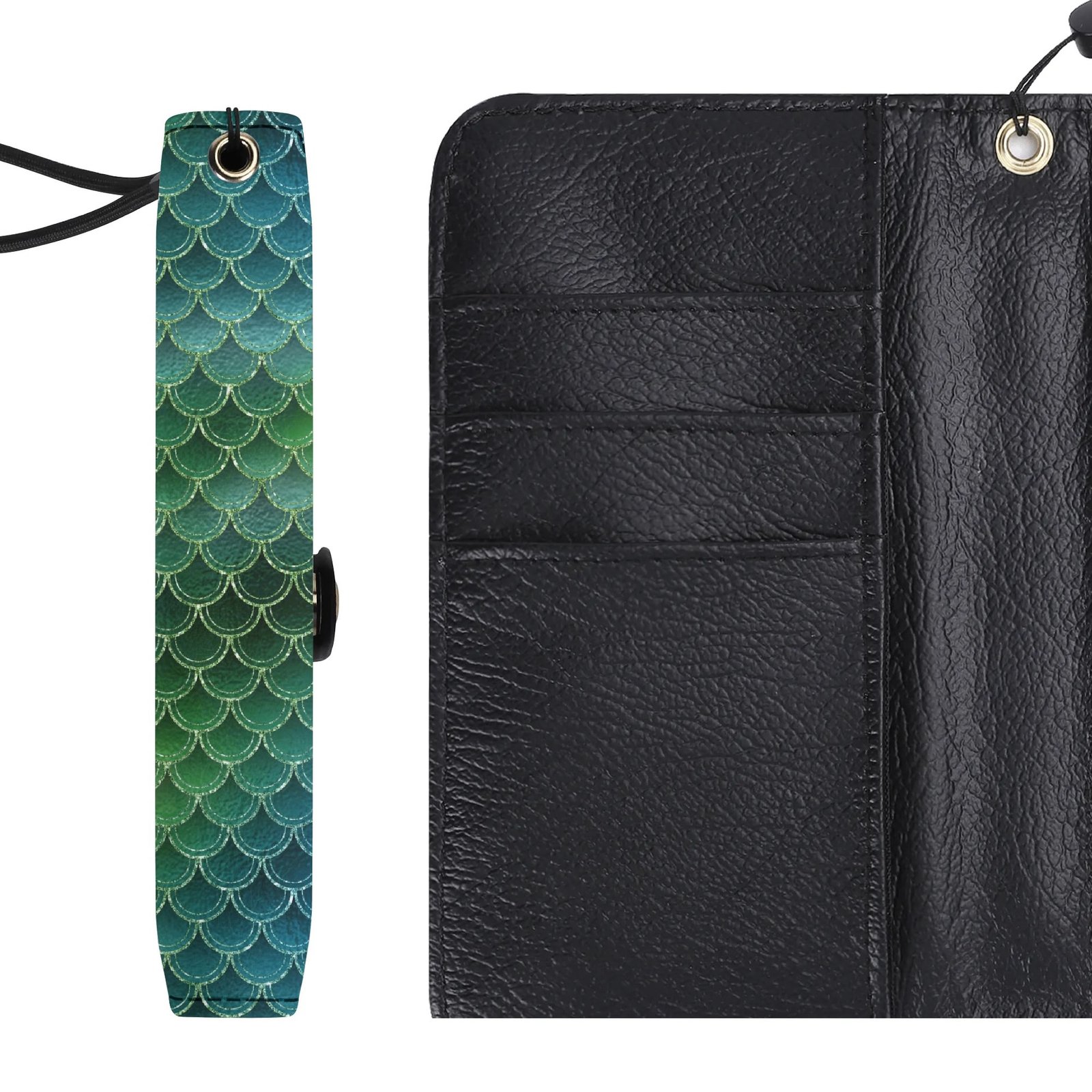 Crafted from high-quality vegan leather this green mermaid phone wallet offers full body phone protection, multiple card slots, a cash compartment, and a flexible phone cradle that fits most smartphone sizes. The detachable wrist strap adds hands-free convenience, making it perfect for days when you want to travel light.
