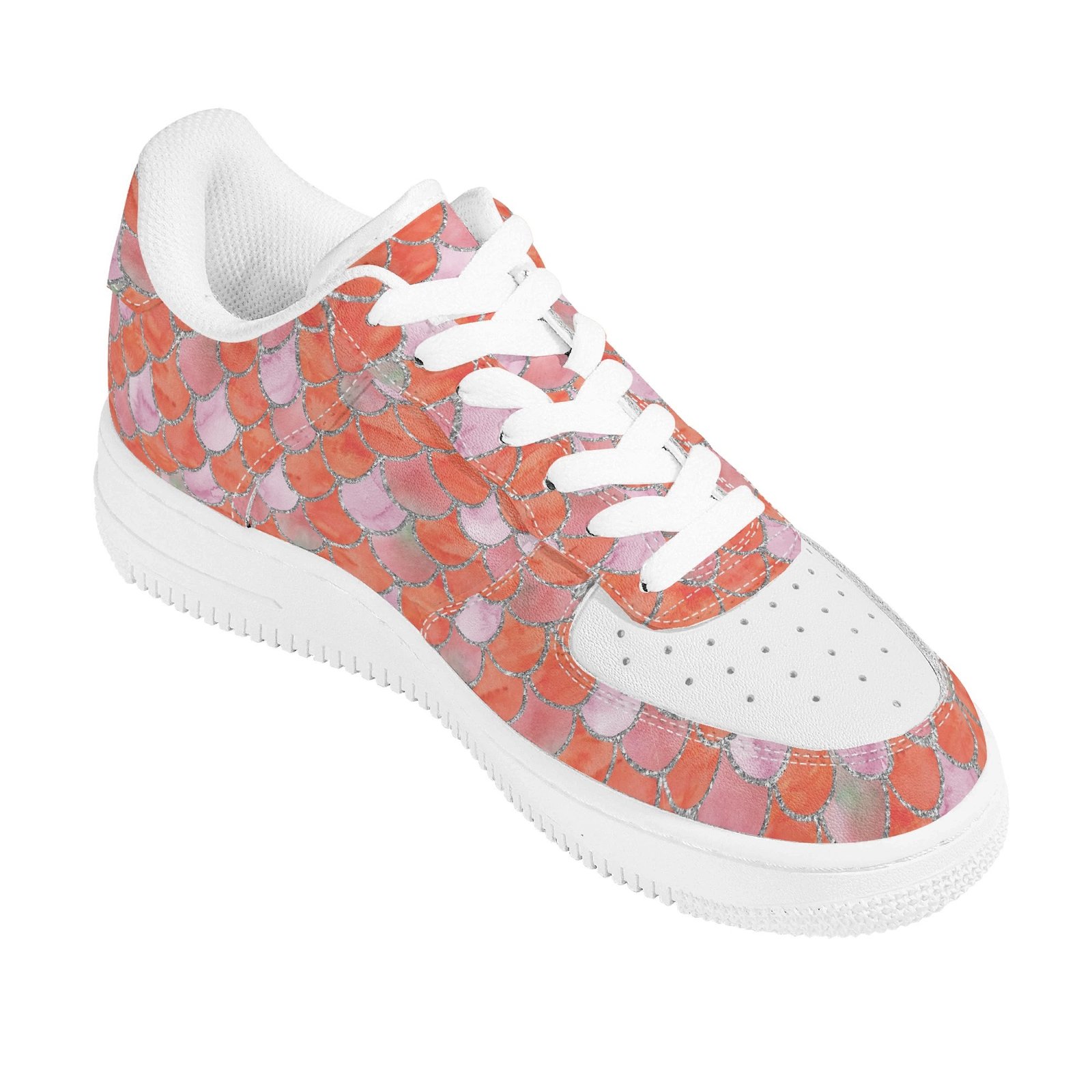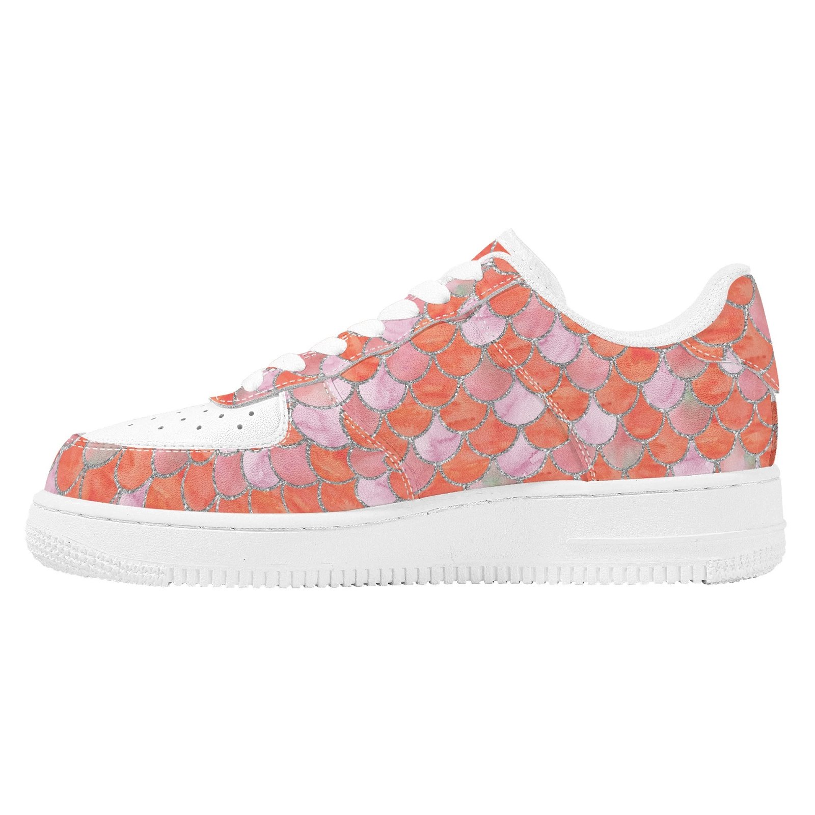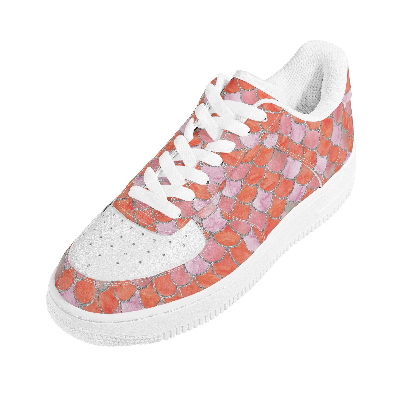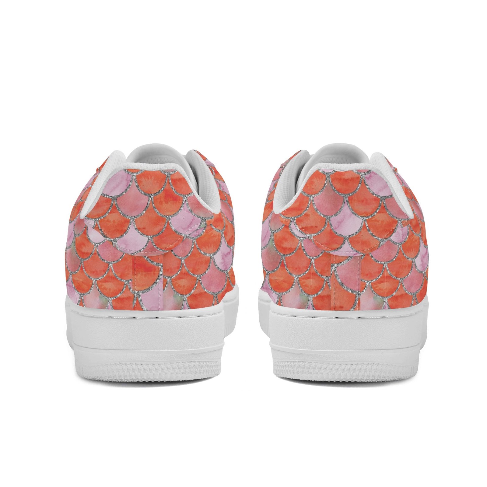 Step into standout style with these vegan leather sneakers featuring an eye-catching orange mermaid scale print. Designed with ocean-inspired energy, the all-over fish scale pattern transforms every step into a bold fashion statement perfect for dreamers, trendsetters, and ocean lovers alike.