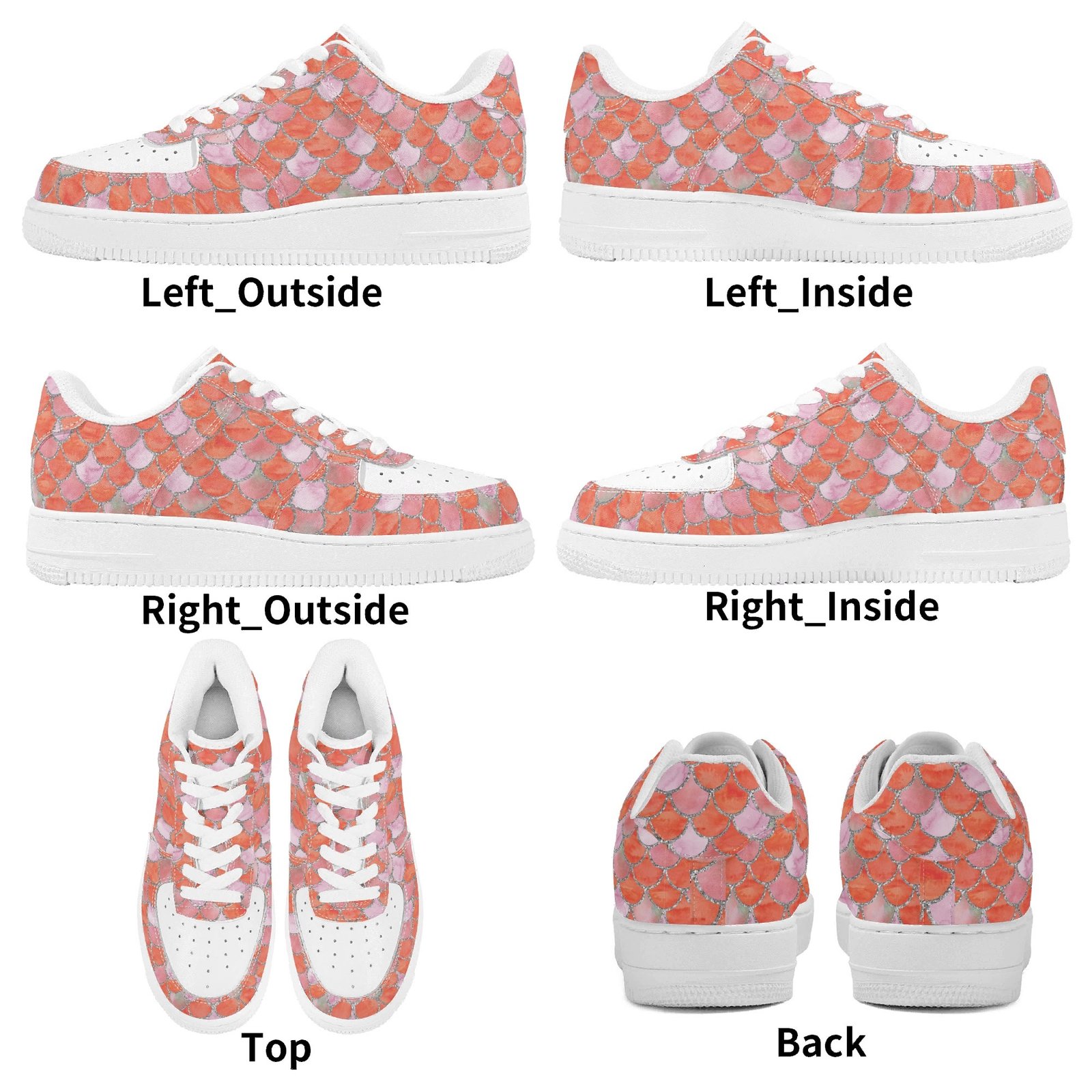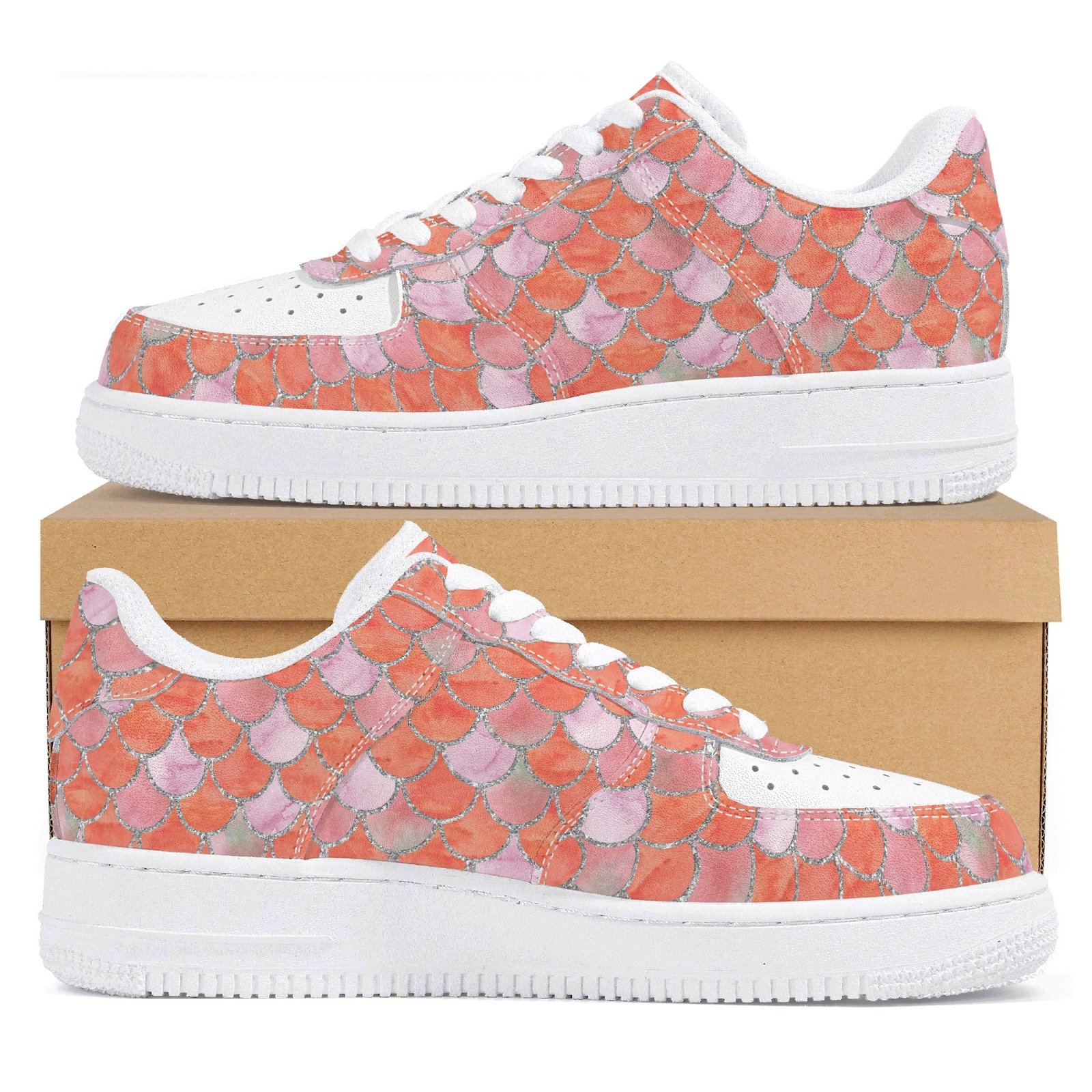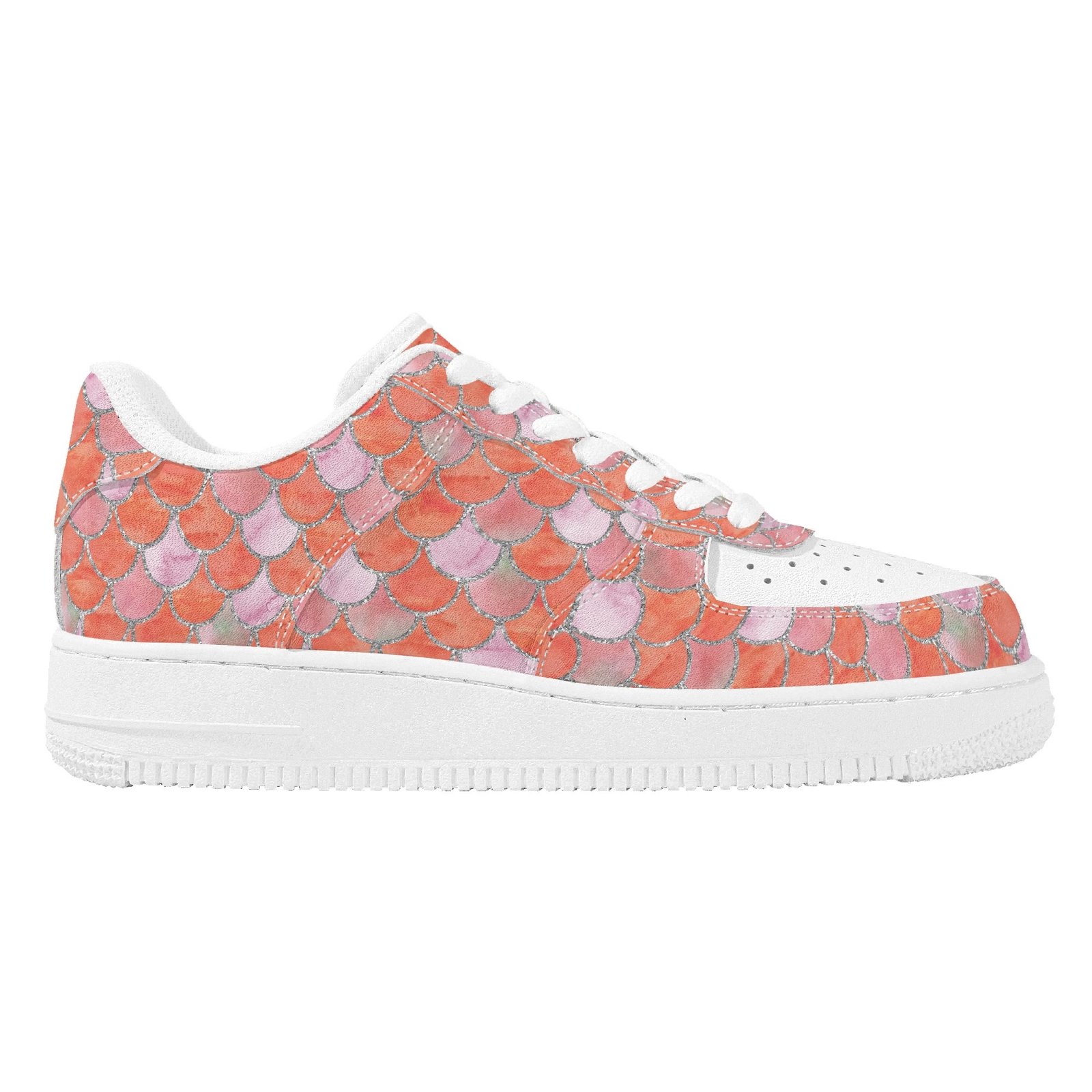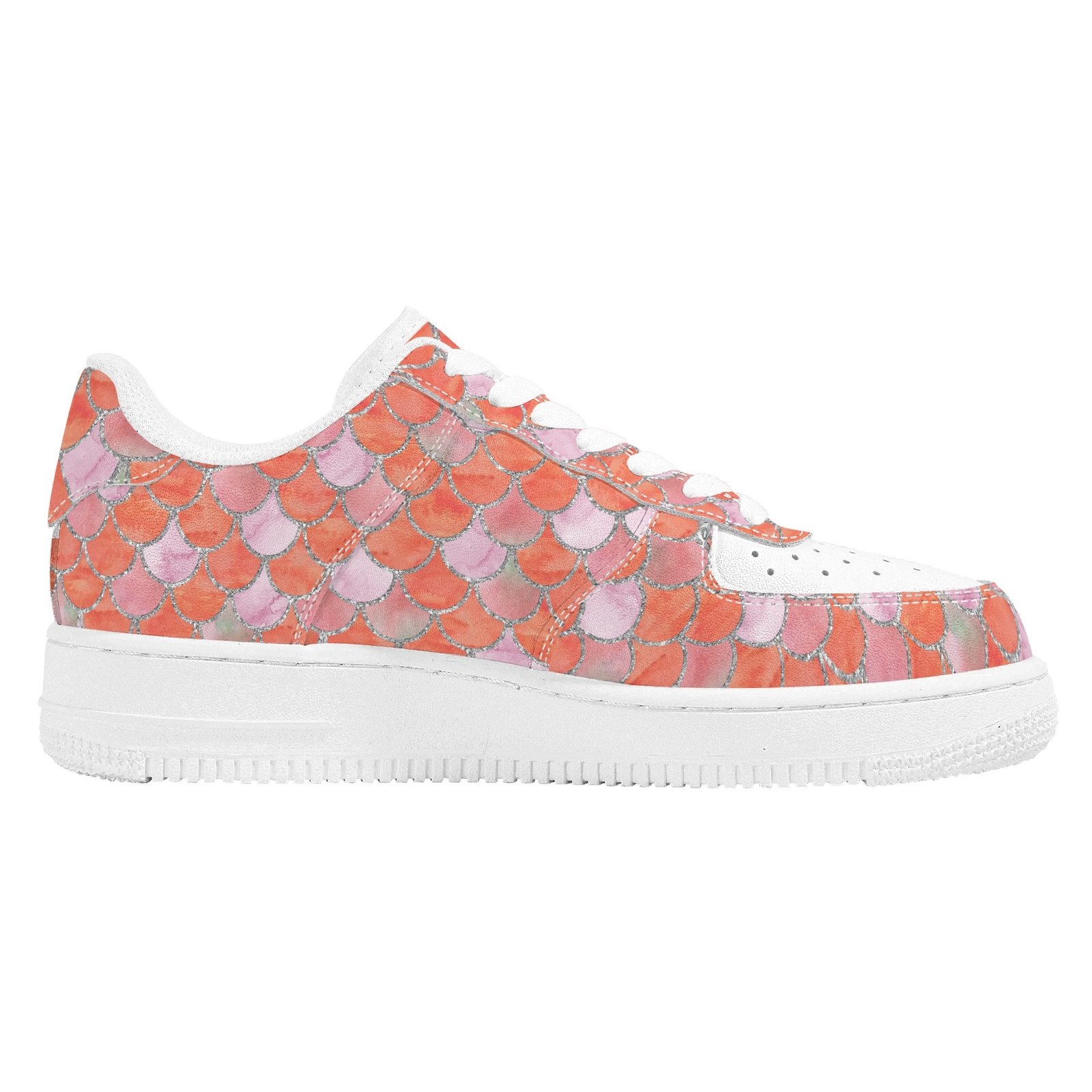 Step into standout style with these vegan leather sneakers featuring an eye-catching orange mermaid scale print. Designed with ocean-inspired energy, the all-over fish scale pattern transforms every step into a bold fashion statement perfect for dreamers, trendsetters, and ocean lovers alike.