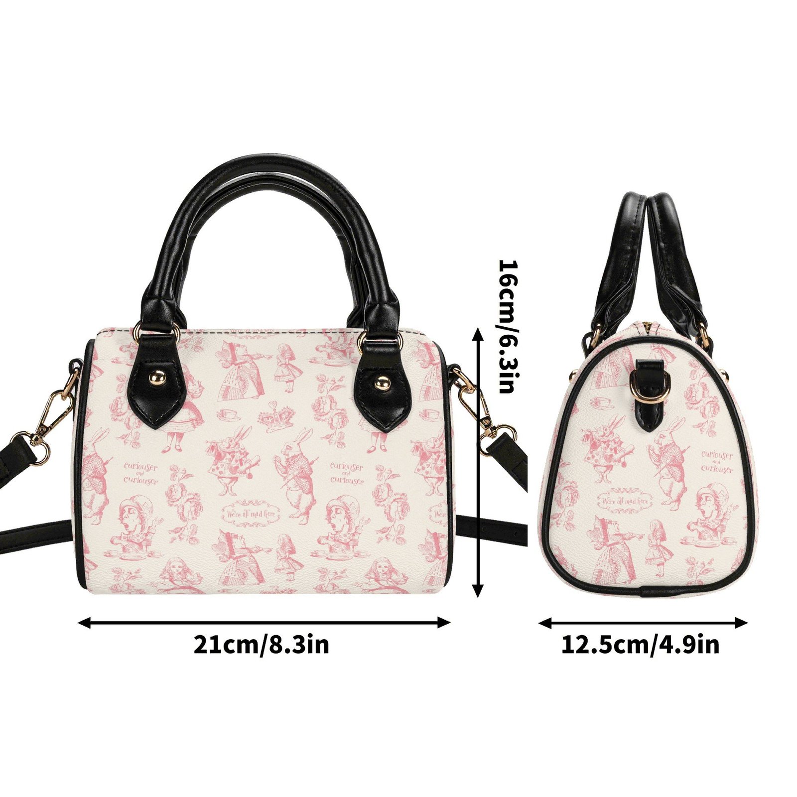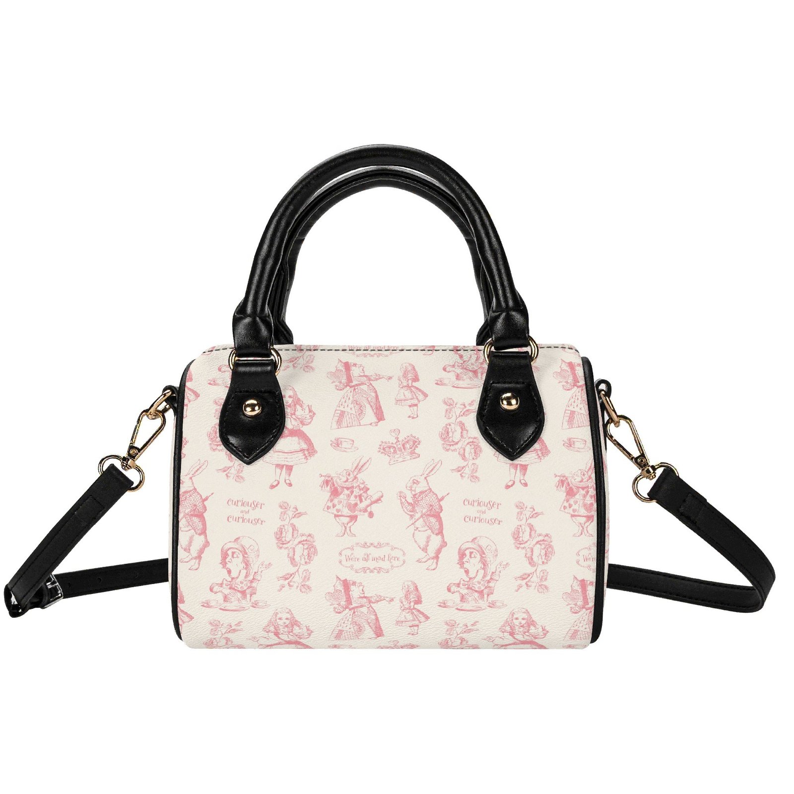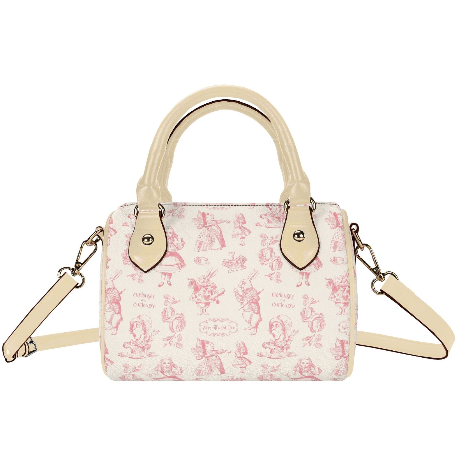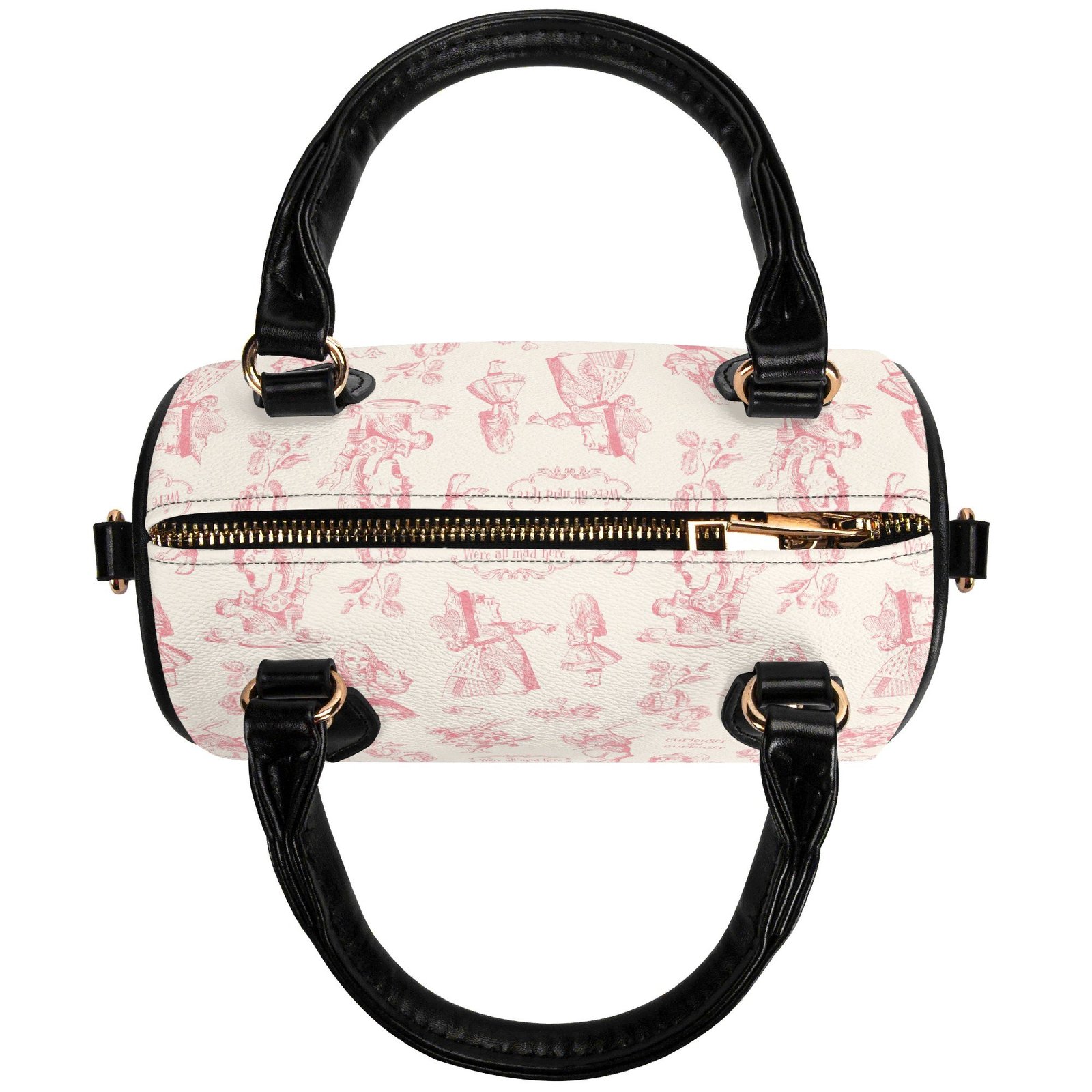 Alice in Wonderland mini bag in a barrel shape, sometimes called a Boston bag. It’s small and rounded with a top handle and detachable/adjustable shoulder strap. It has one main pouch and two inner side pockets. It is made of vegan leather decorated with pink illustrations from the original Lewis Carroll book.