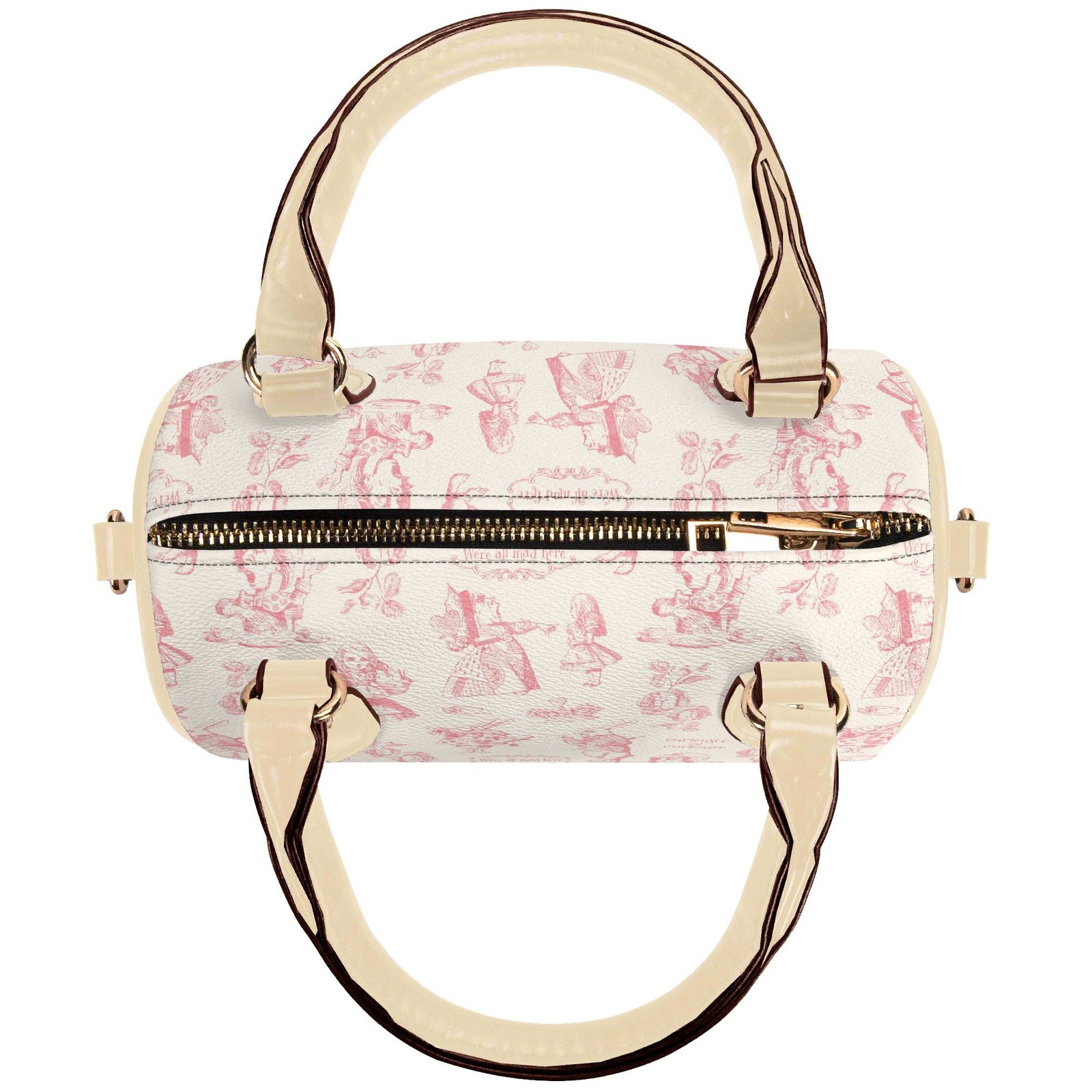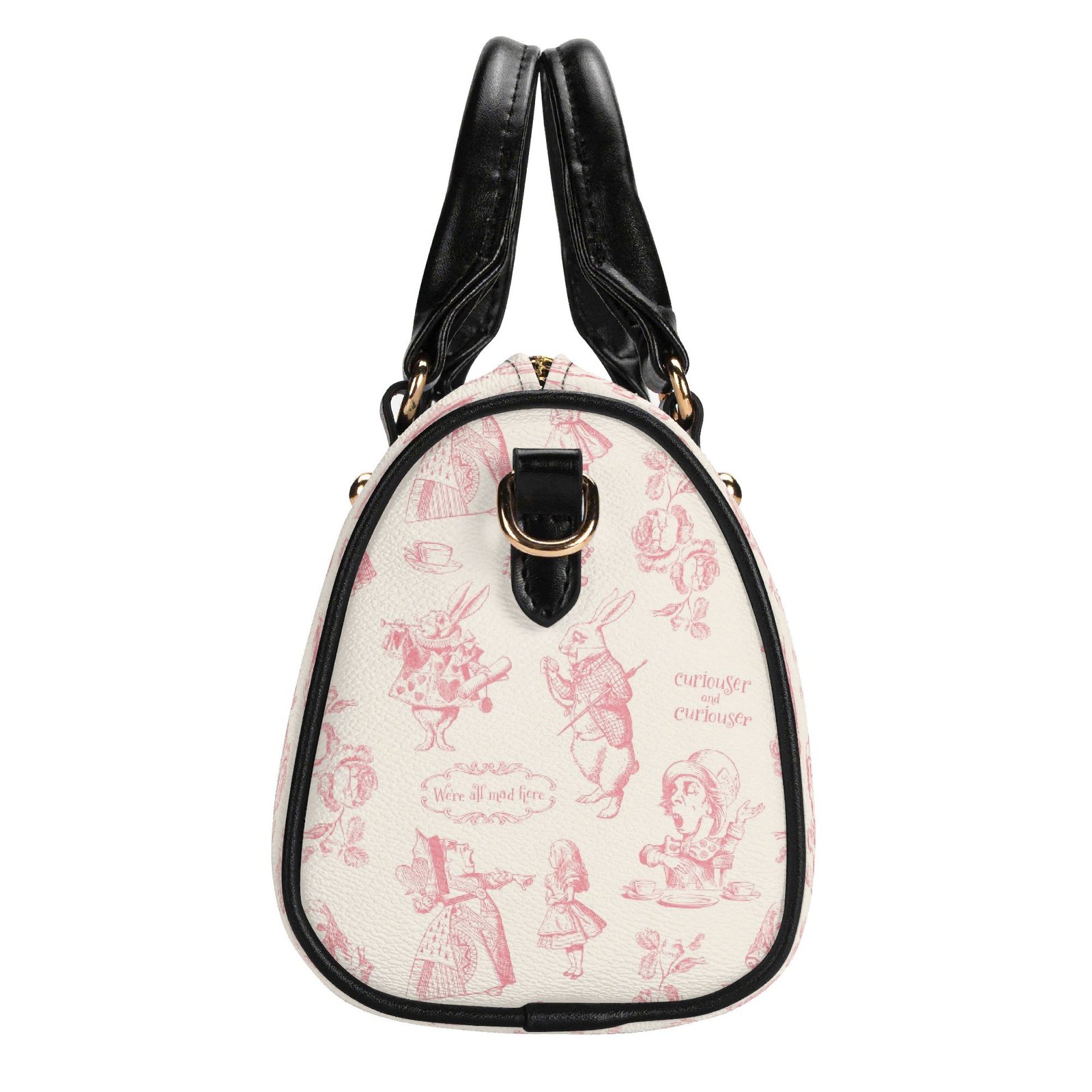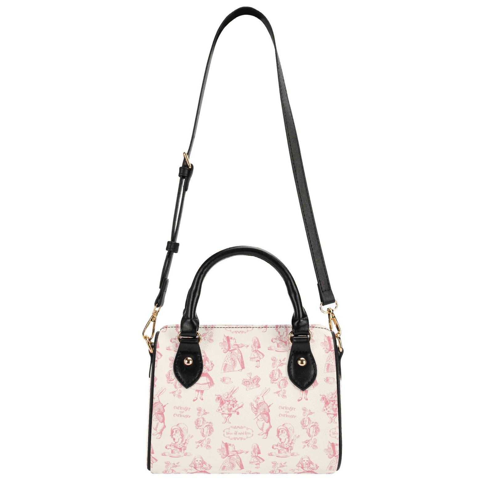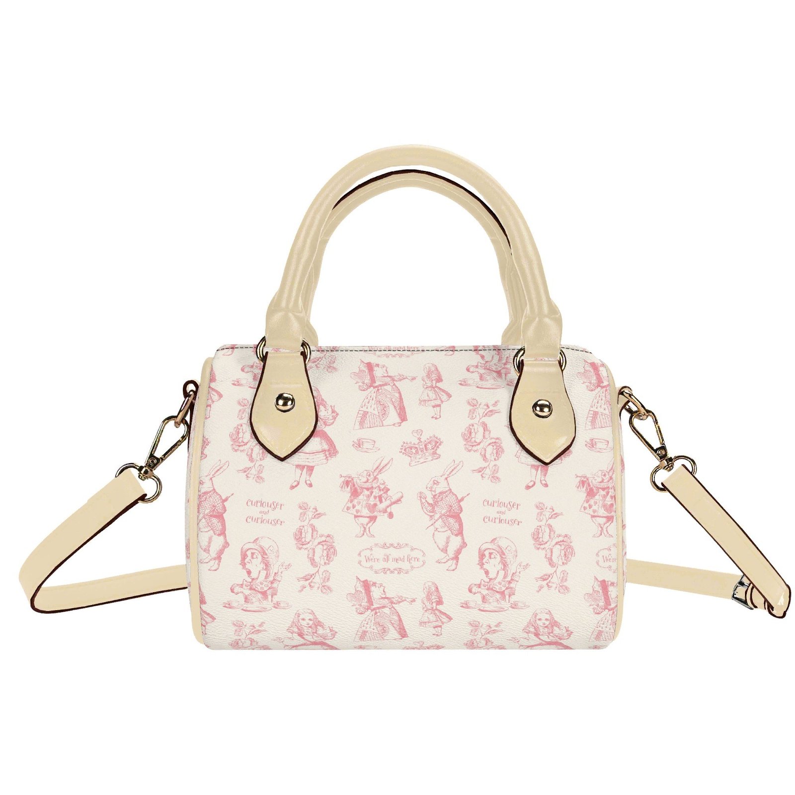 Alice in Wonderland mini bag in a barrel shape, sometimes called a Boston bag. It’s small and rounded with a top handle and detachable/adjustable shoulder strap. It has one main pouch and two inner side pockets. It is made of vegan leather decorated with pink illustrations from the original Lewis Carroll book.