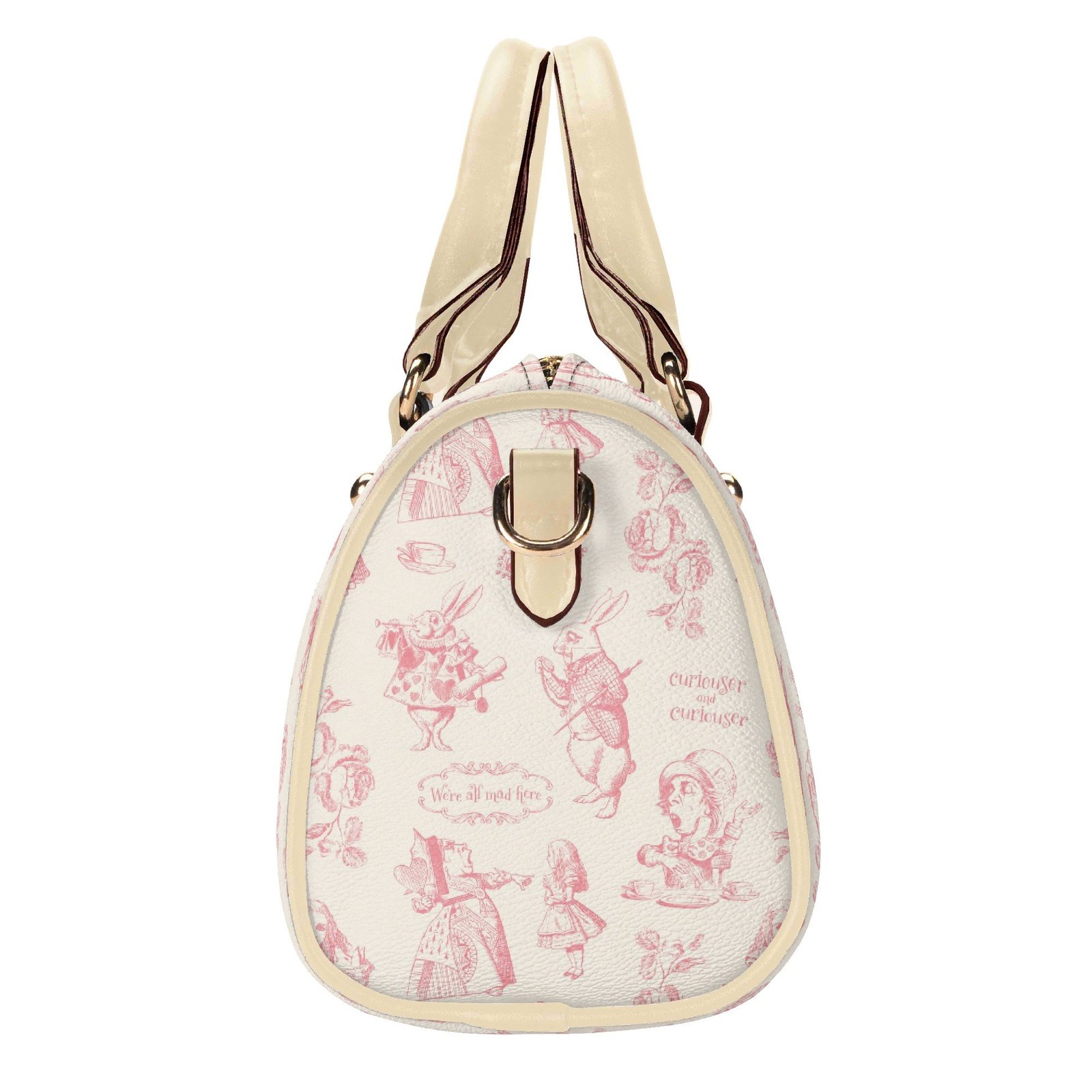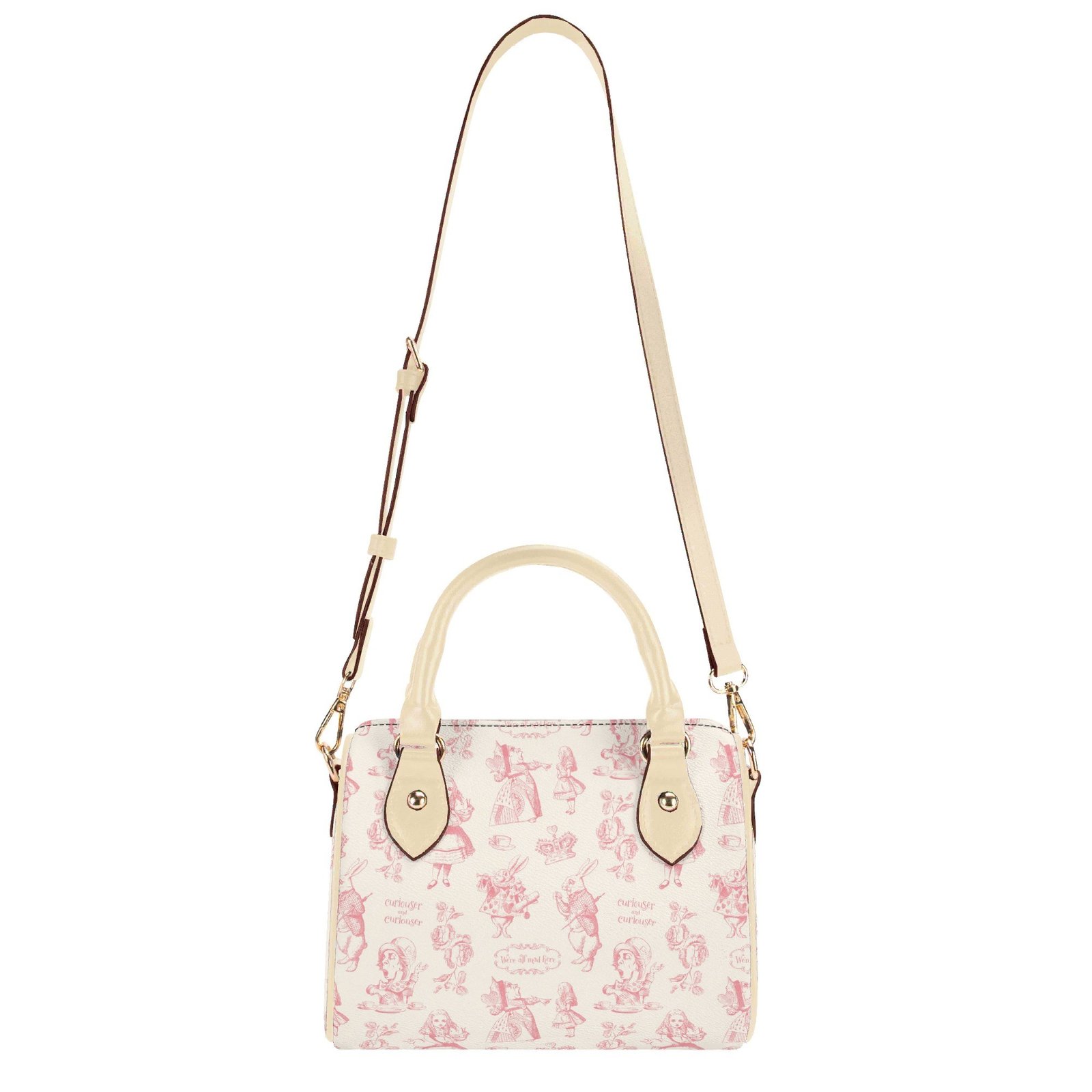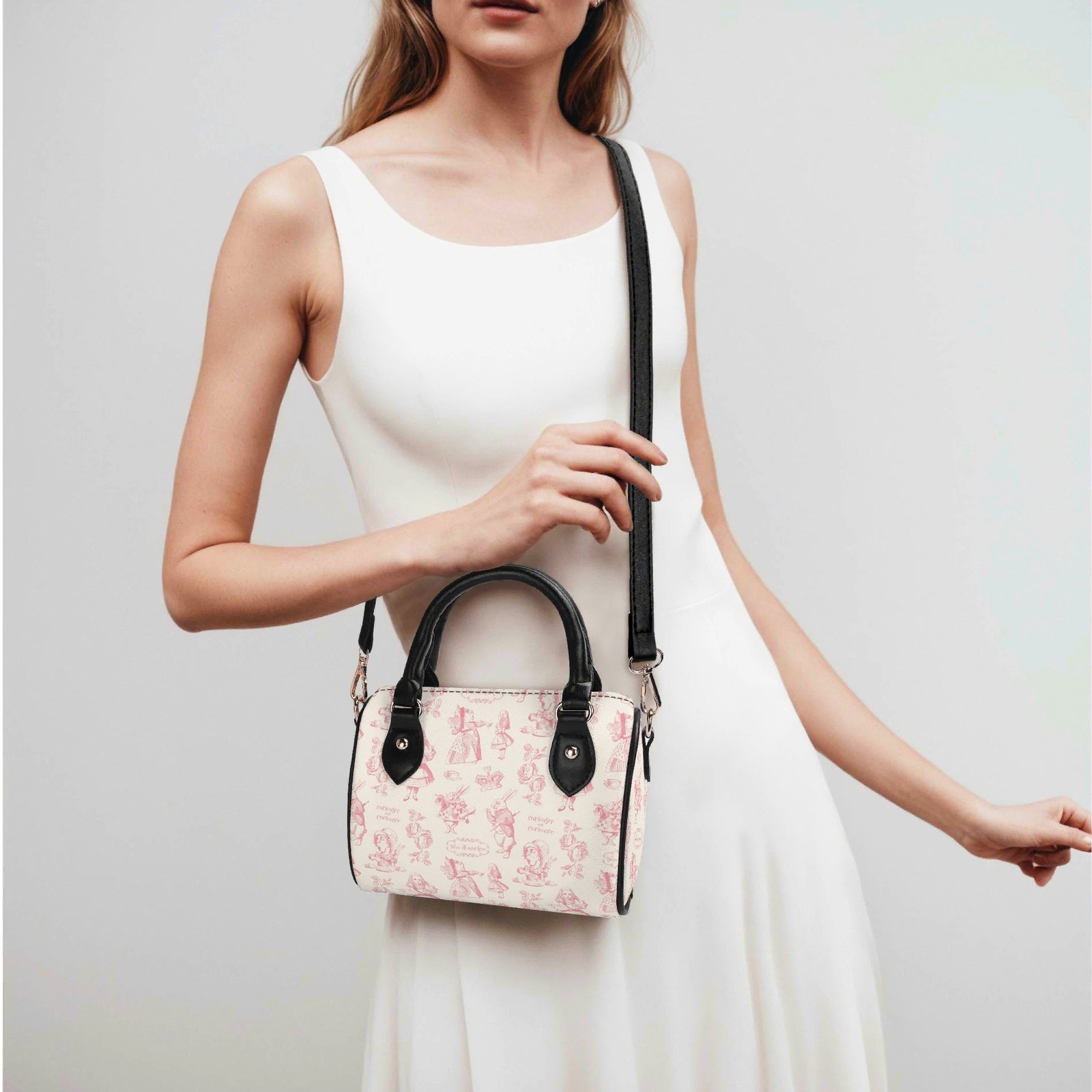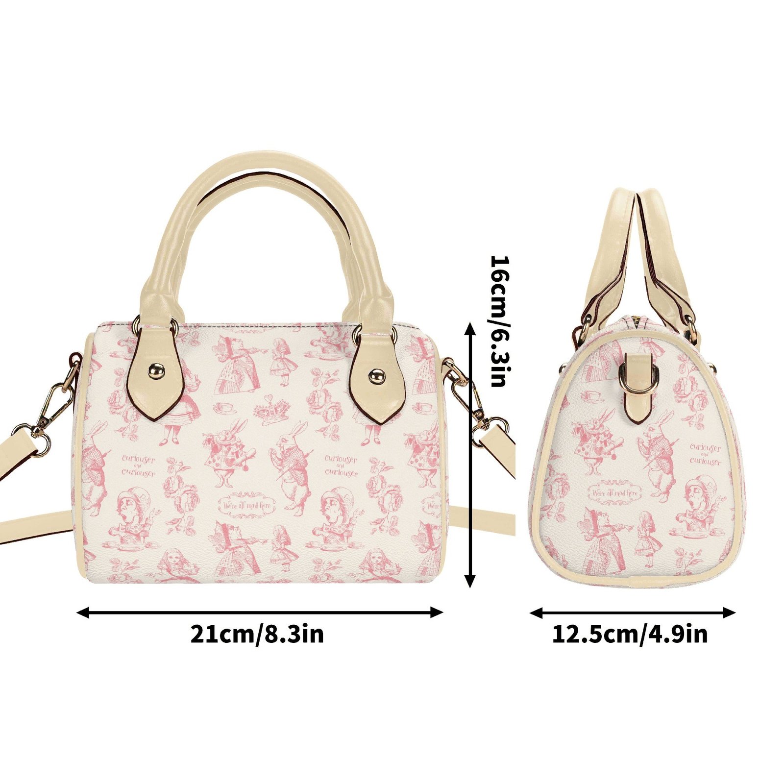Alice in Wonderland mini bag in a barrel shape, sometimes called a Boston bag. It’s small and rounded with a top handle and detachable/adjustable shoulder strap. It has one main pouch and two inner side pockets. It is made of vegan leather decorated with pink illustrations from the original Lewis Carroll book.