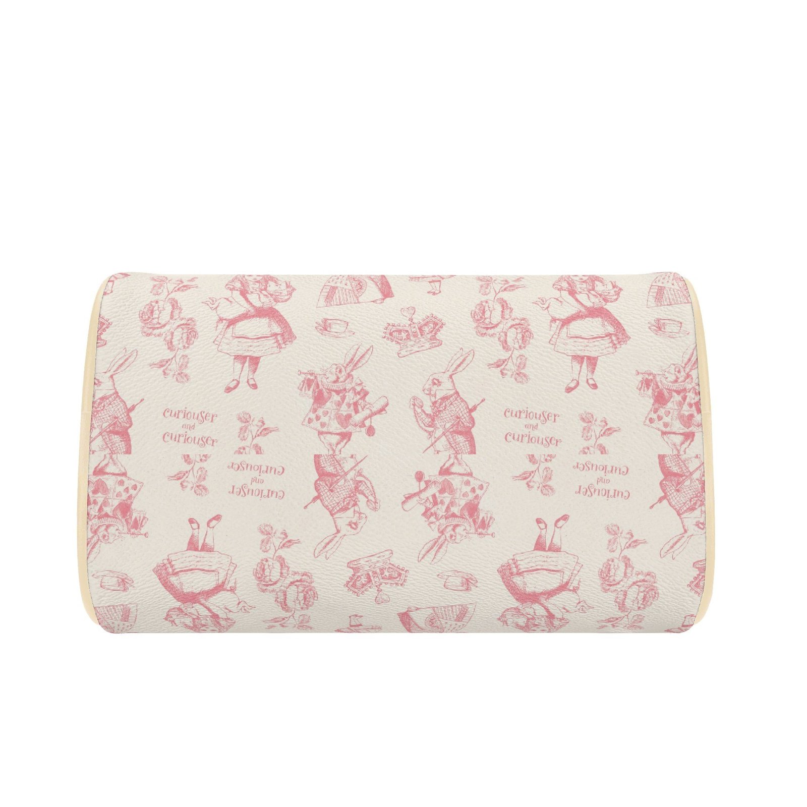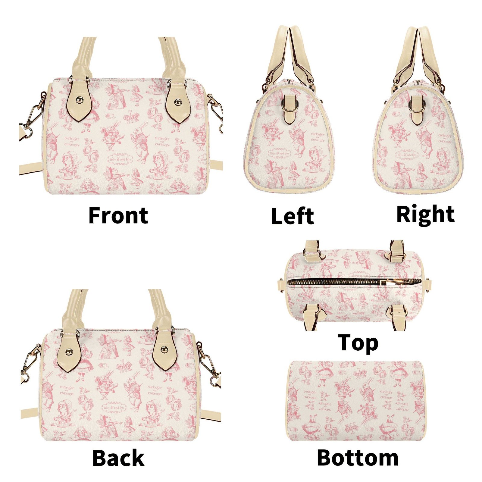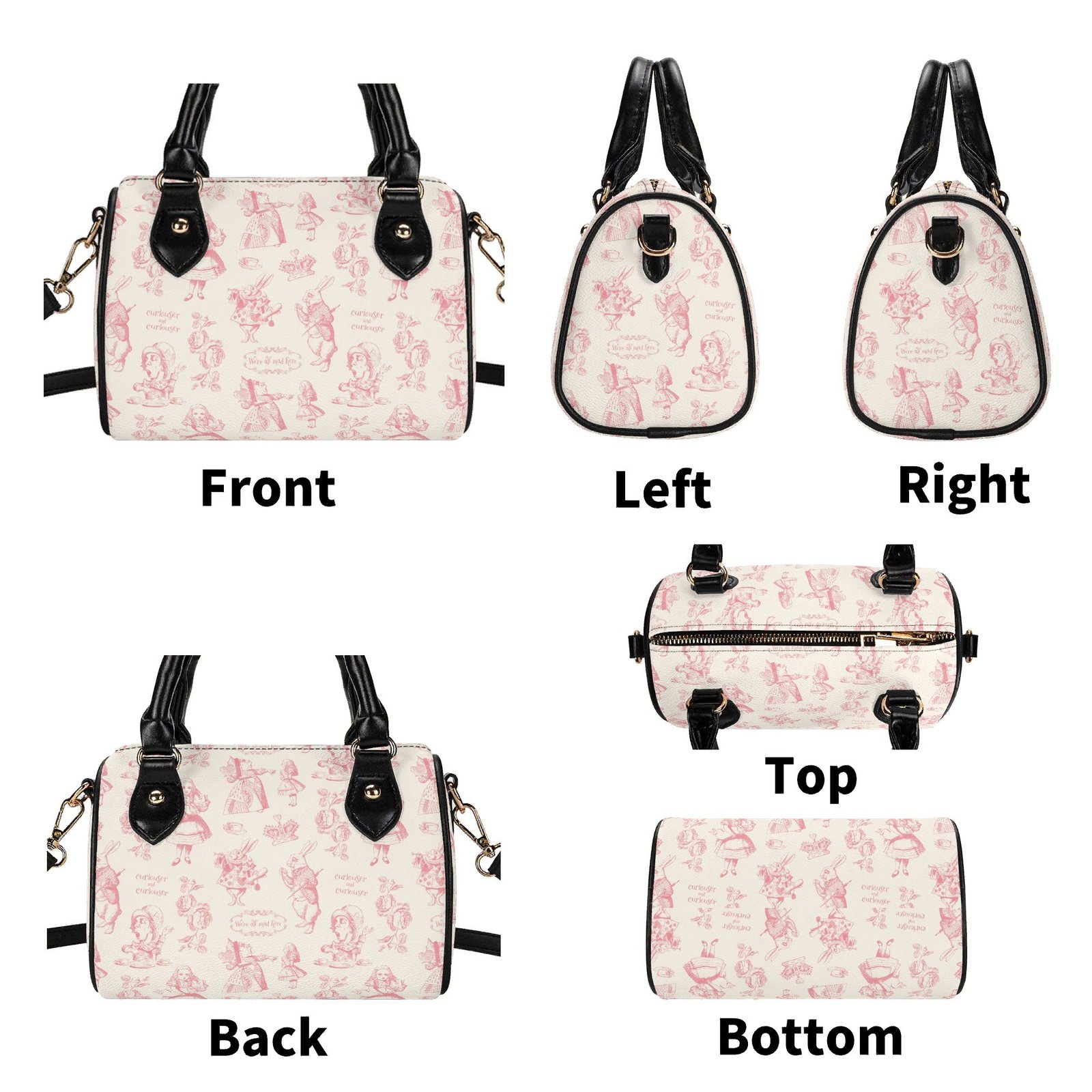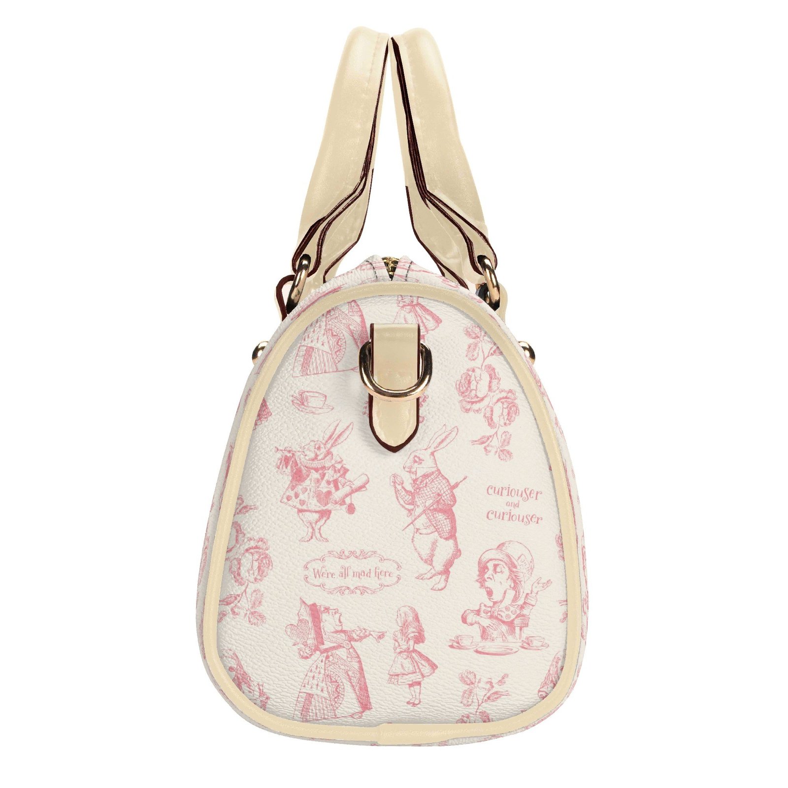 Alice in Wonderland mini bag in a barrel shape, sometimes called a Boston bag. It’s small and rounded with a top handle and detachable/adjustable shoulder strap. It has one main pouch and two inner side pockets. It is made of vegan leather decorated with pink illustrations from the original Lewis Carroll book.