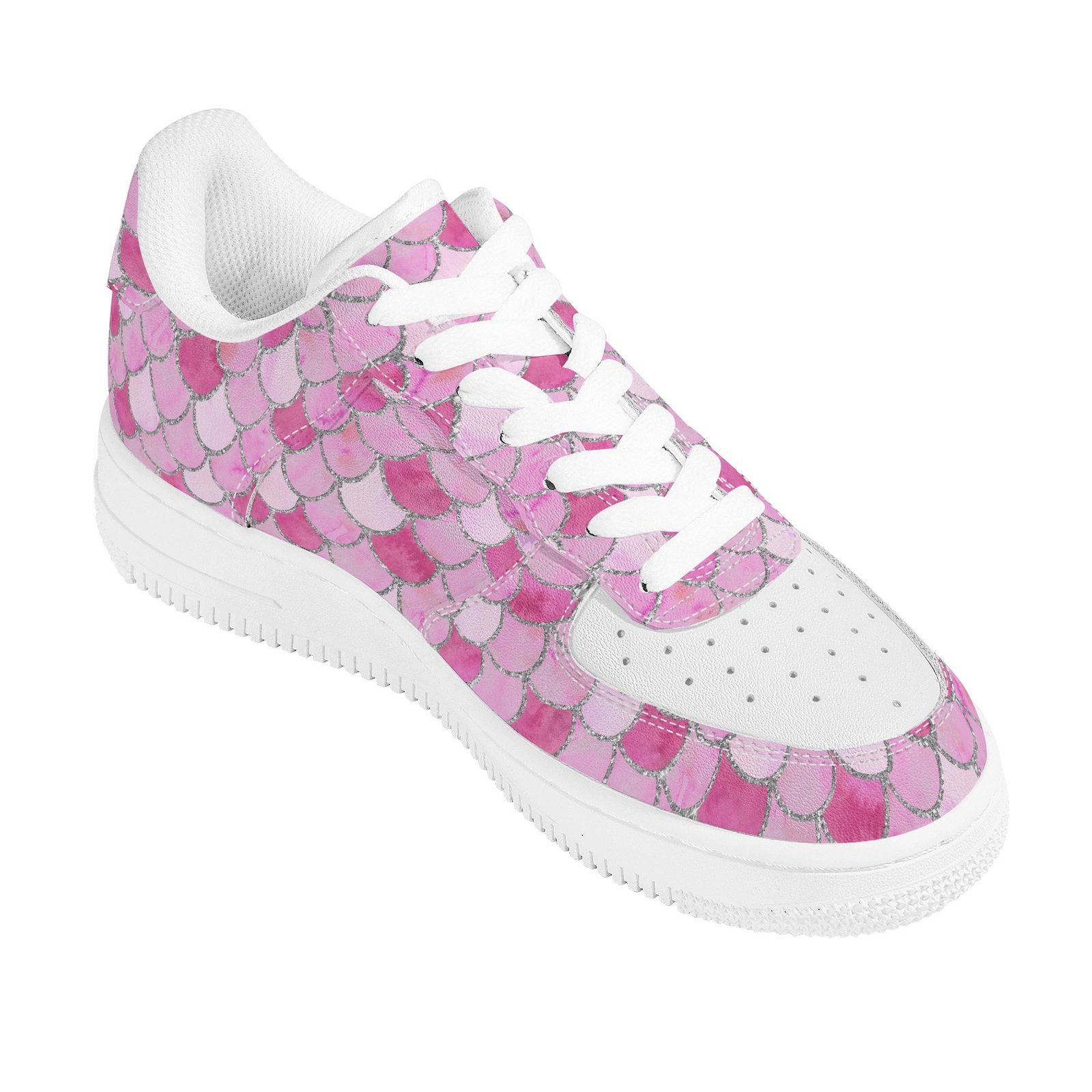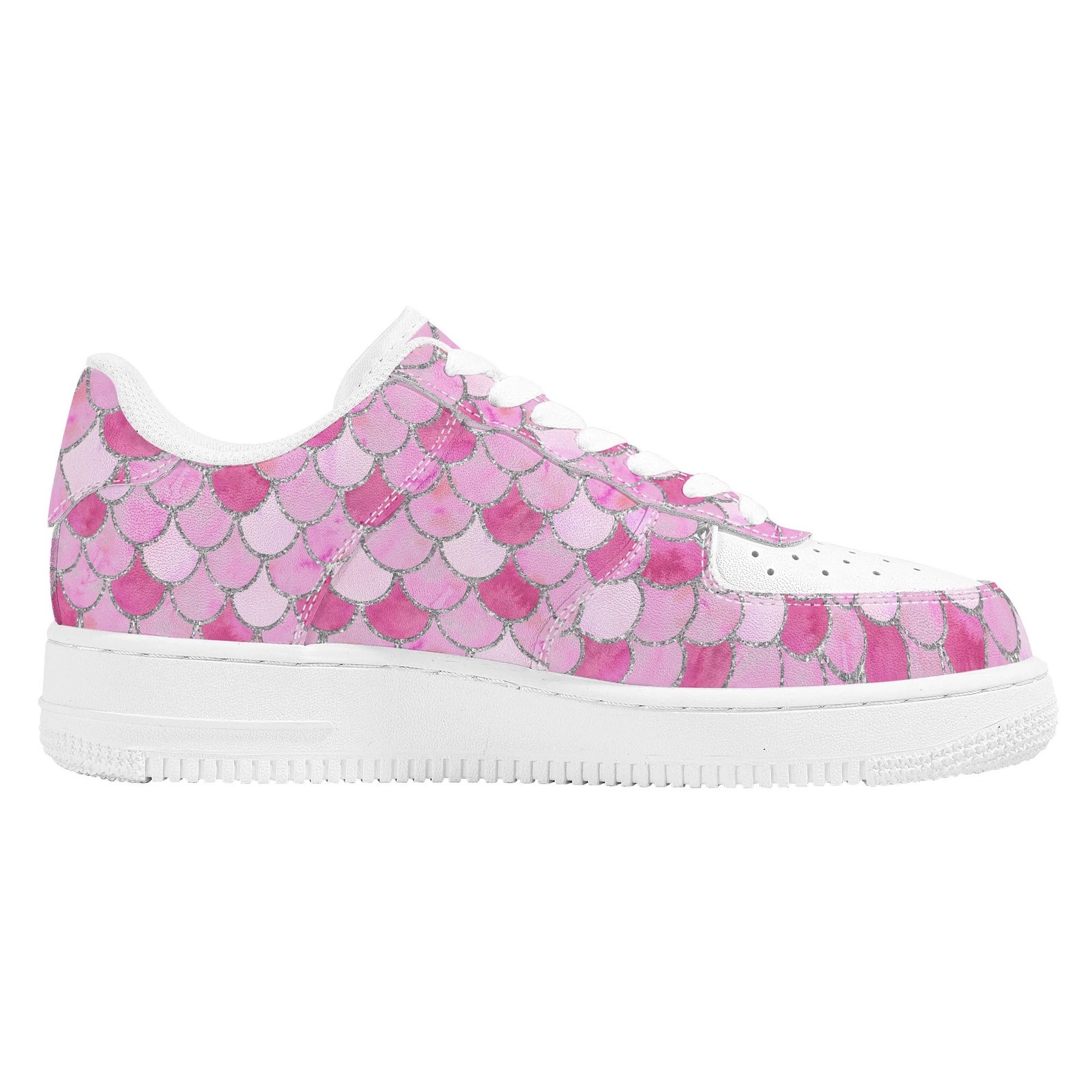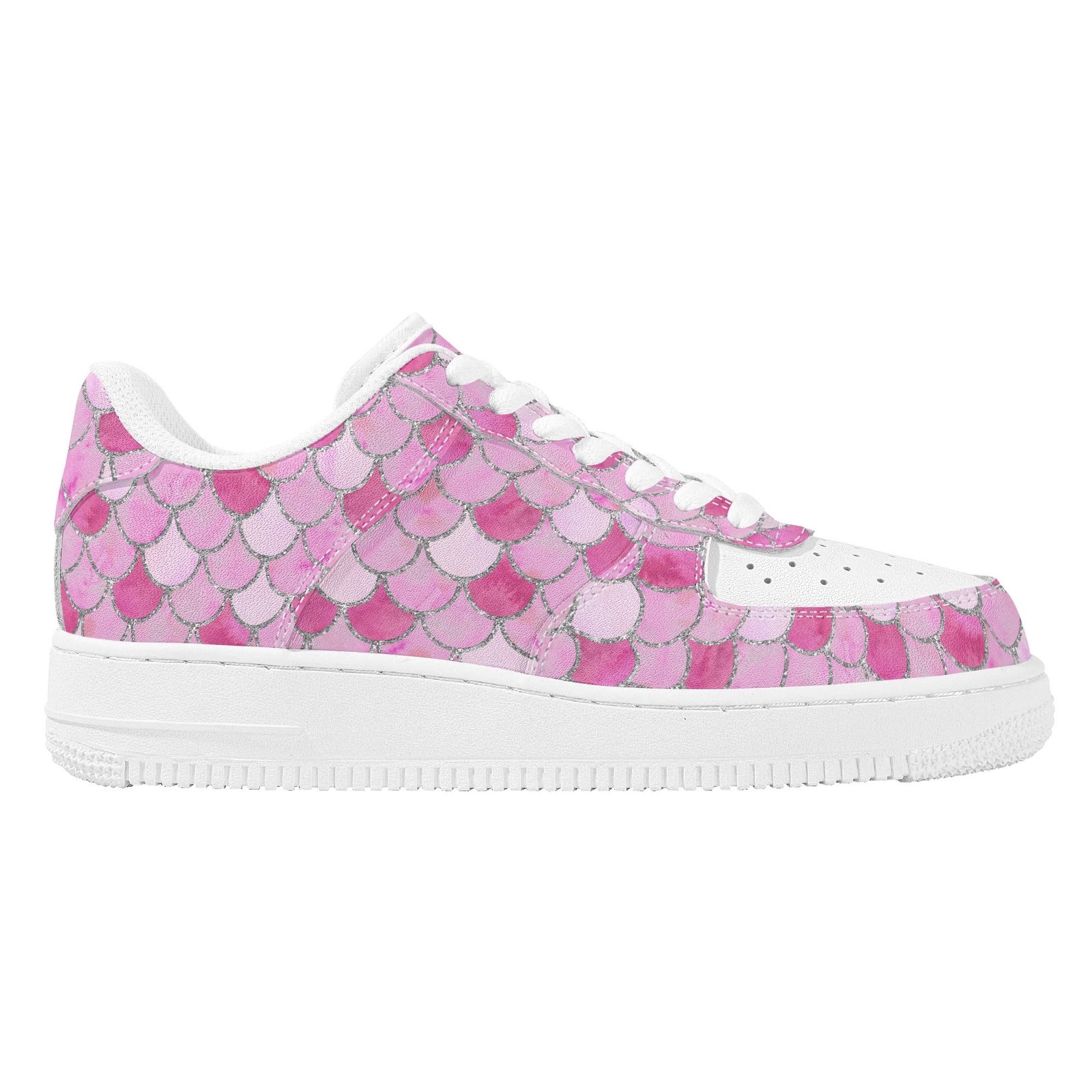 Step into standout style with these vegan leather sneakers featuring an eye-catching pink mermaid scale print. Designed with ocean-inspired energy, the all-over fish scale pattern transforms every step into a bold fashion statement perfect for dreamers, trendsetters, and ocean lovers alike.