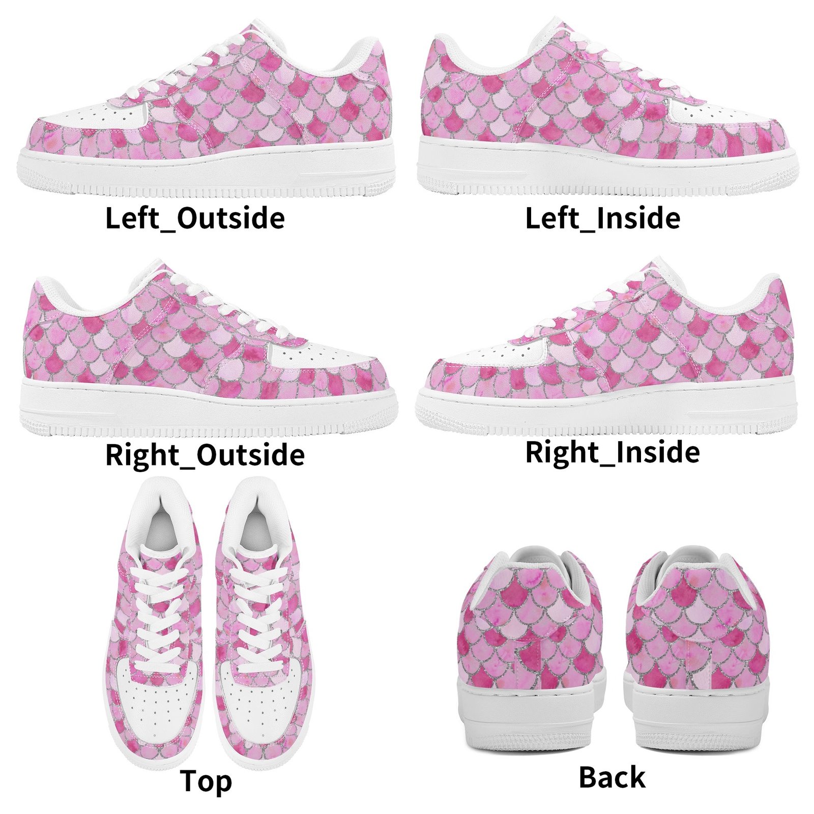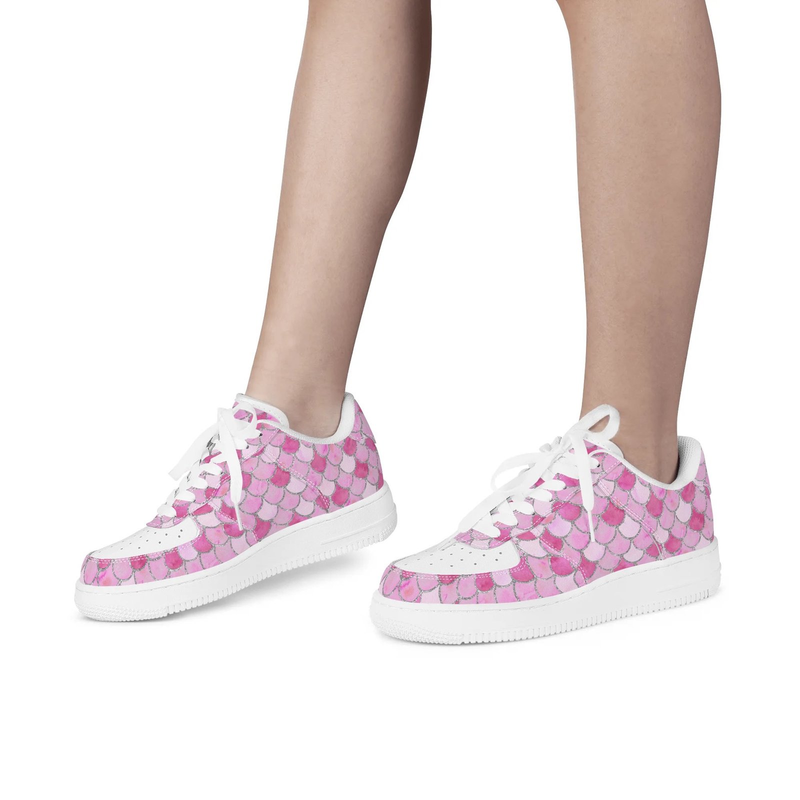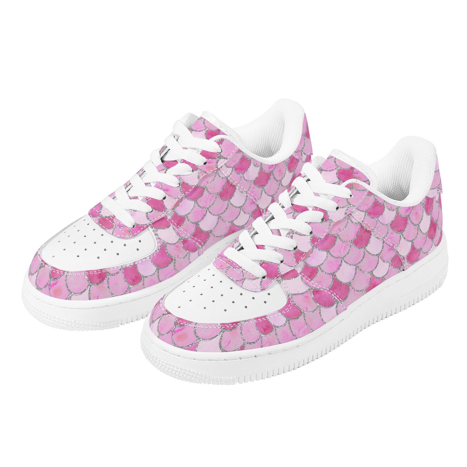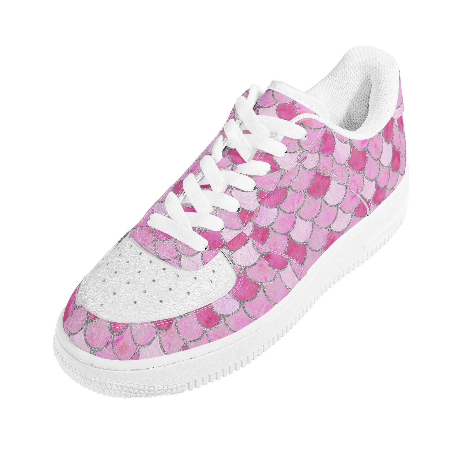 Step into standout style with these vegan leather sneakers featuring an eye-catching pink mermaid scale print. Designed with ocean-inspired energy, the all-over fish scale pattern transforms every step into a bold fashion statement perfect for dreamers, trendsetters, and ocean lovers alike.