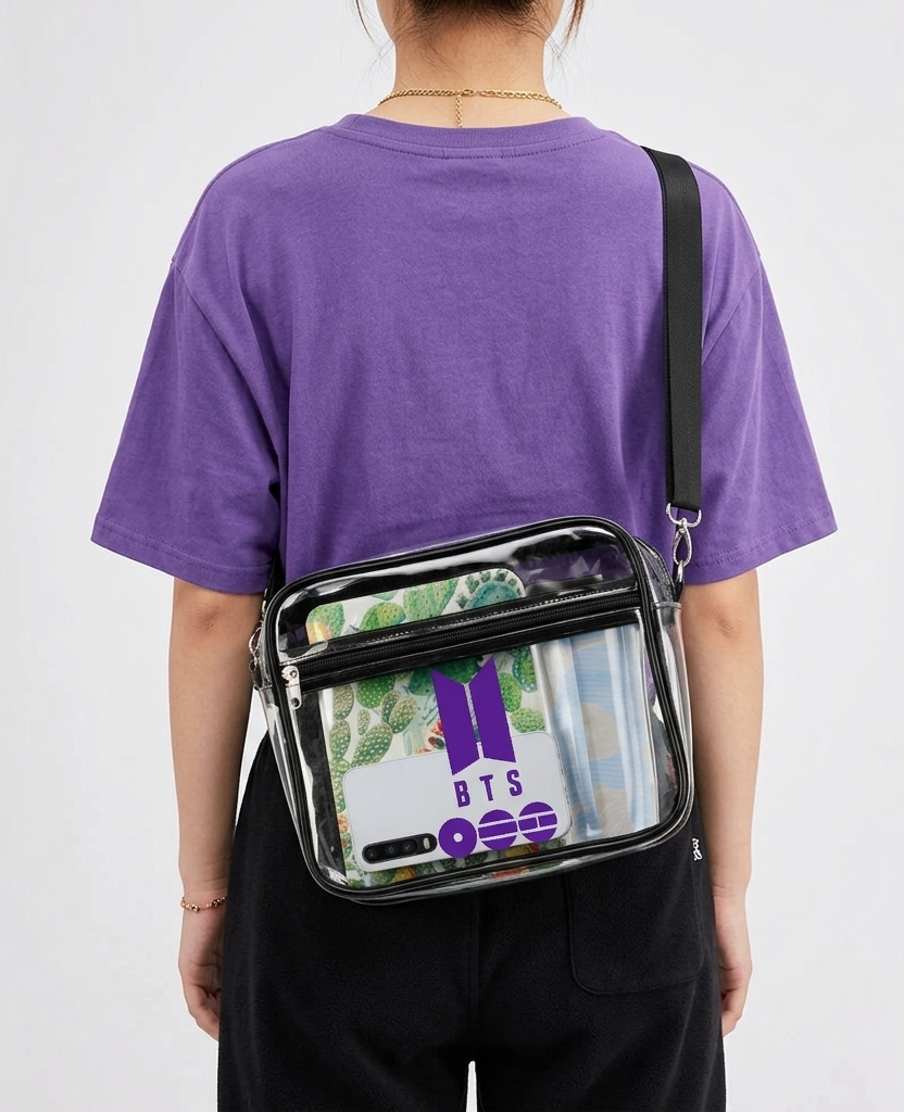 This transparent crossbody bag has a spacious interior, it offers large capacity storage while keeping your things visible and easy to access. The bag features a durable clear body with black trim, a secure zip closure, and an adjustable shoulder strap for comfortable everyday wear.