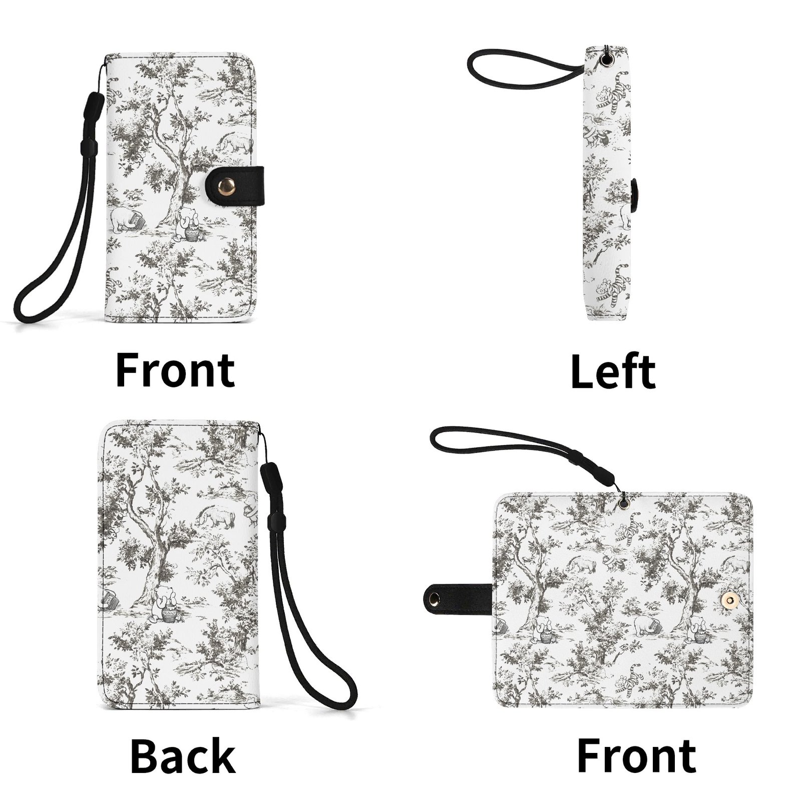An antique-look Winnie the Pooh phone wallet in elegant, romantic Toile de Jouy. Crafted from high-quality vegan leather this phone case wallet offers full body phone protection, multiple card slots, a cash compartment, and a flexible phone cradle that fits most smartphone sizes. The detachable wrist strap adds hands-free convenience, making it perfect for days when you want to travel light.