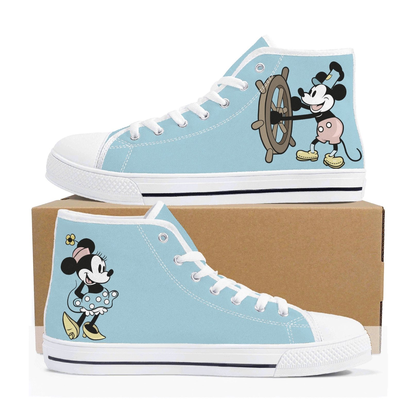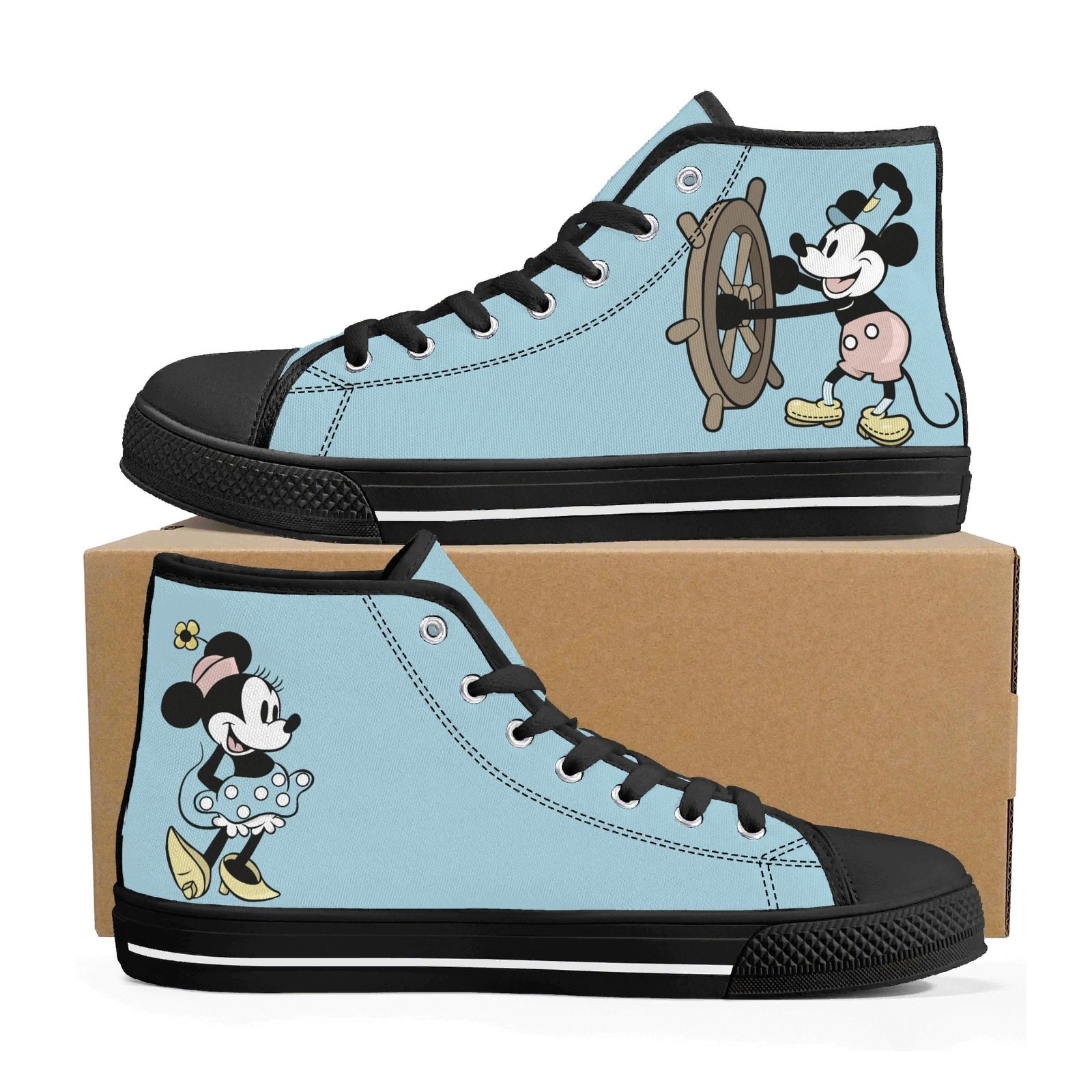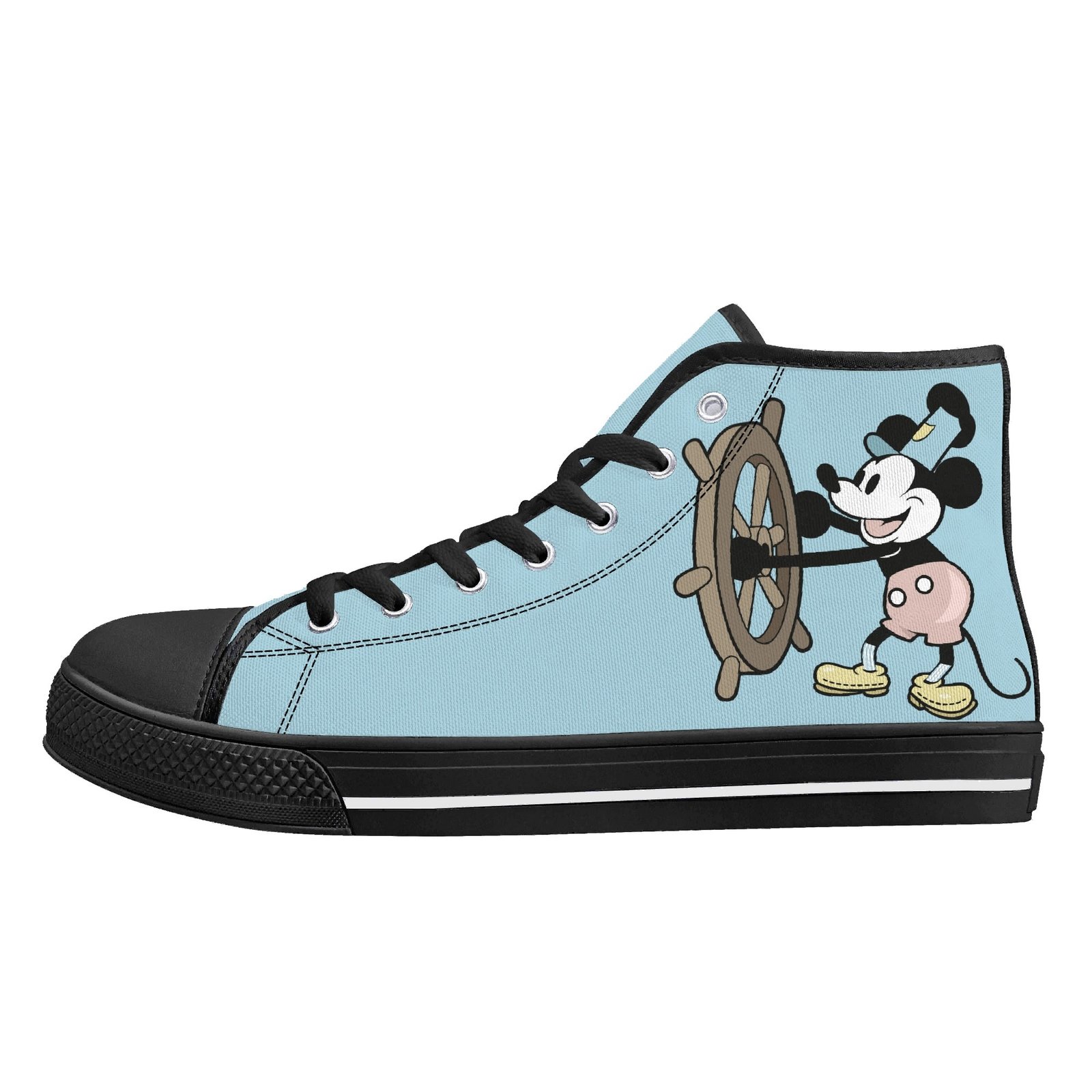 Step into a little magic and adventure with these Steamboat Willie women’s high top canvas shoes, designed to turn everyday outfits into a story worth telling. Featuring a charming nautical theme, the iconic mouse takes the helm of a ship on the outer side, while his female other half appears on the inner side, creating a playful, collectible-style design that feels special from every angle.